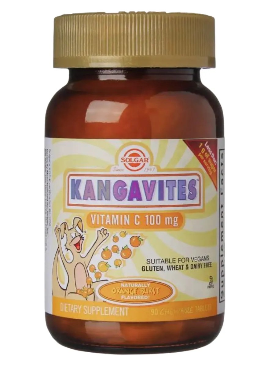 Solgar Kangavites with Vitamin C tablets (orange flavor) are chewable tablets with vitamin C to strengthen the immune system and protect against colds.