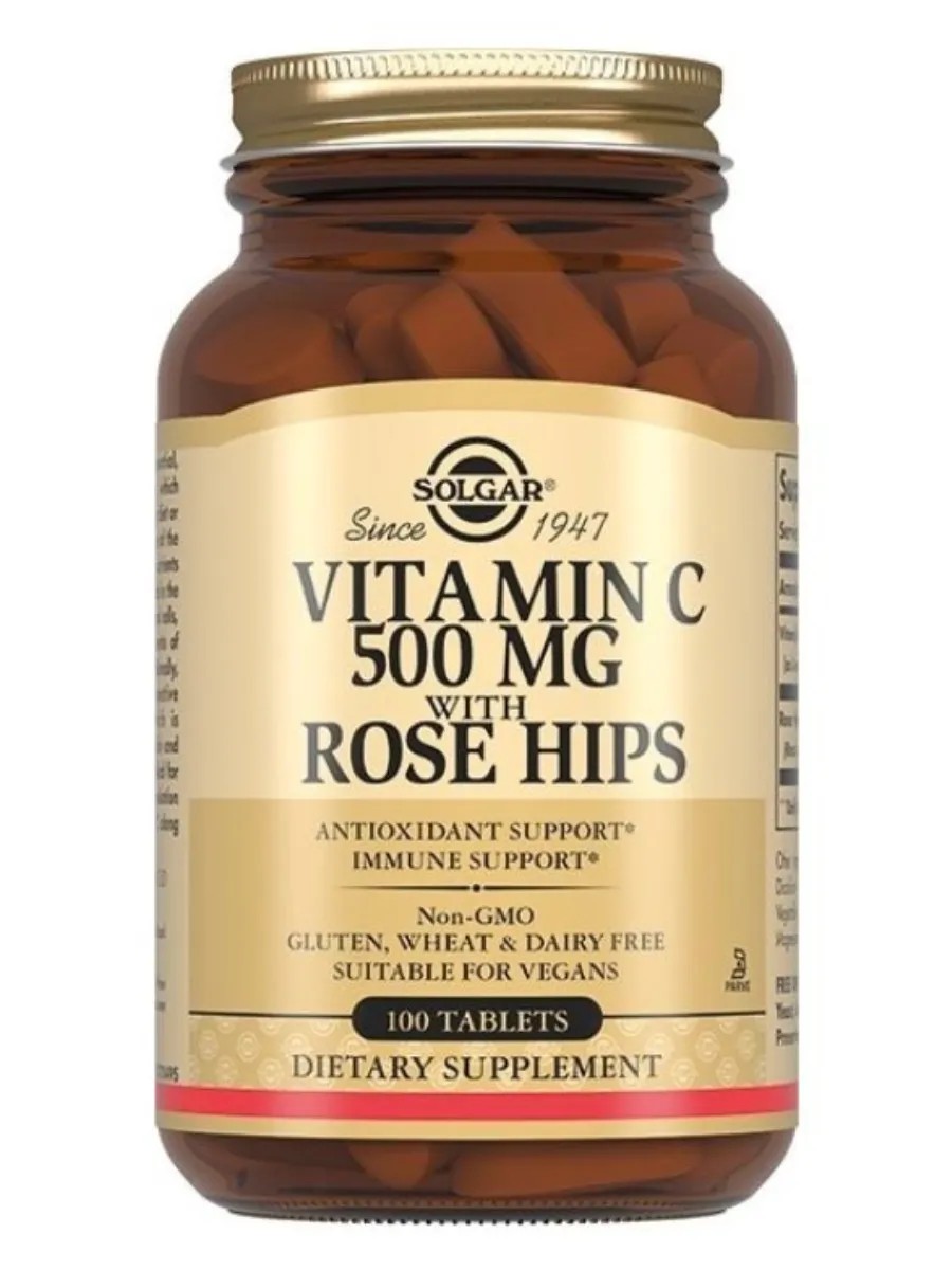 Solgar Vitamin C with Rosehip Tablets - tablets with vitamin C and rosehip extract to boost immunity and protect against colds.