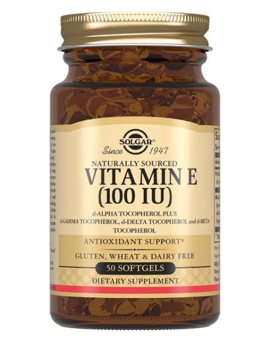 Солгар Витамин Е 100 ME капс - источник витамина E для защиты клеток от свободных радикалов и поддержки здоровья кожи. Улучшает состояние кожи и замедляет старение. Капсулы «Витамин Е 100 МЕ» (Vitamin E 100 IU Soft gels) - содержит натуральный витамин Е, представленный в виде d-альфа токоферола, а так же смесь изомеров токоферола (d-бета, d-дельта, d- гамма), которые усиливают антиоксидантные свойства витамина Е.