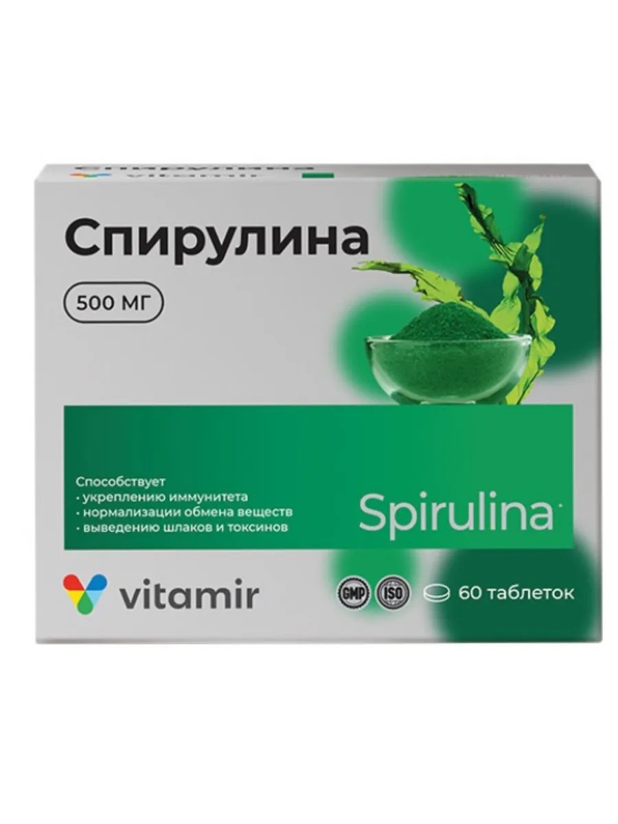 Спирулина 500 мг 60 штук — это биологически активная добавка к пище, которая содержит высокую концентрацию спирулины. Спирулина – это одноклеточная сине-зеленая водоросль., которая являются ценным источником источника фикоцианинов и бета-каротина. Эта добавка помогает поддерживать здоровье кожи, волос и ногтей, а также улучшает иммунную систему . Каждая таблетка содержит 500 мг спирулины, которая была выращена в естественных условиях. Спирулина 500 мг 60 штук является безопасной и эффективной добавкой к вашей диете. Спирулина - это удивительно полезная простейшая одноклеточная сине-зеленая водоросль. Количество и разнообразие биологически активных веществ в ее составе поистине уникально: спирулина содержит около 2000 компонентов. В ней содержится 60-75% белка с практически максимальным уровнем усвоения, а также макроэлементы (K, Na, Mg, Ca, P), микроэлементы (Se, Fe, Mn, Со, Сu, Zn, Мо, Ni), витамины (Е и группы В), полиненасыщенные жирные кислоты, антиоксиданты, ферменты, нуклеиновые кислоты и растительные пигменты (хлорофилл, каротиноиды и фикоцианин).