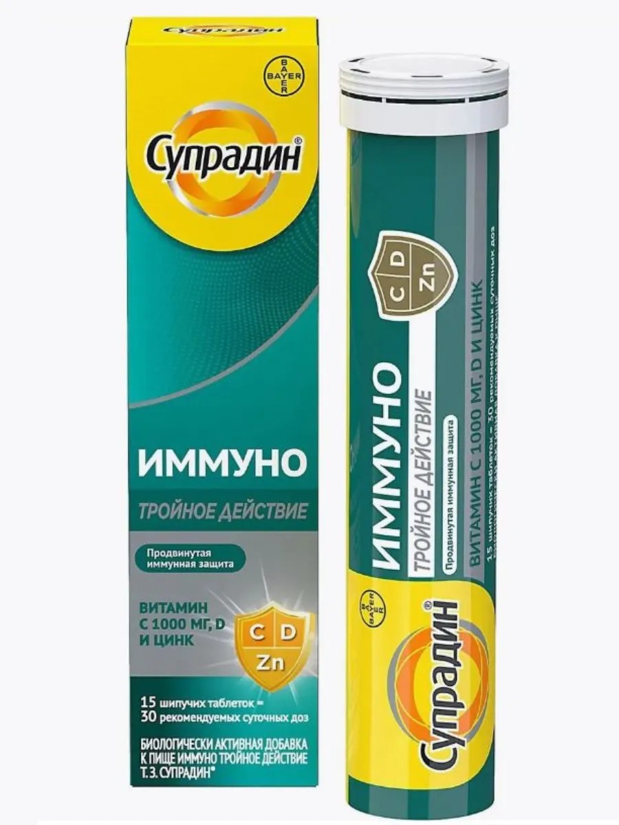 Супрадин Иммуно Тройное действие табл шип - шипучие таблетки для укрепления иммунитета, энергии и общего здоровья. Содержат витамины, минералы и экстракты растений, которые поддерживают иммунную систему и повышают сопротивляемость организма. Усиленная иммунная защита в период высокой активности вирусов благодаря высокой дозировке витамина C в комплексе с витамином D и Цинком.
