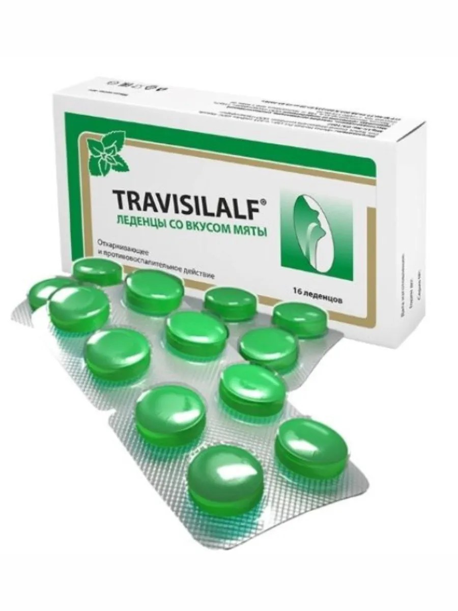 Travisilalf mint-flavored lozenges are a dietary supplement that has an anti-inflammatory effect on sore throats and upper respiratory tract, and an expectorant effect on coughs (including smoker's cough).