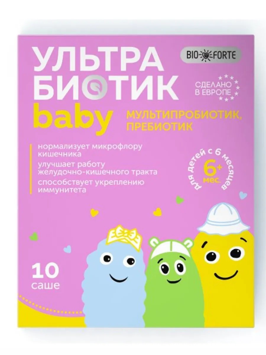 УльтраБиотик Бэби BioForte пор саше - пробиотик в форме порошка для детей. Содержит полезные бактерии, которые улучшают пищеварение, укрепляют иммунитет и помогают справиться с коликами. Биологически активная добавка к пище УльтраБиотик Бэби является источником бифидои лактобактерий. Рекомендуется для улучшения работы желудочно-кишечного тракта и укрепления иммунитета.