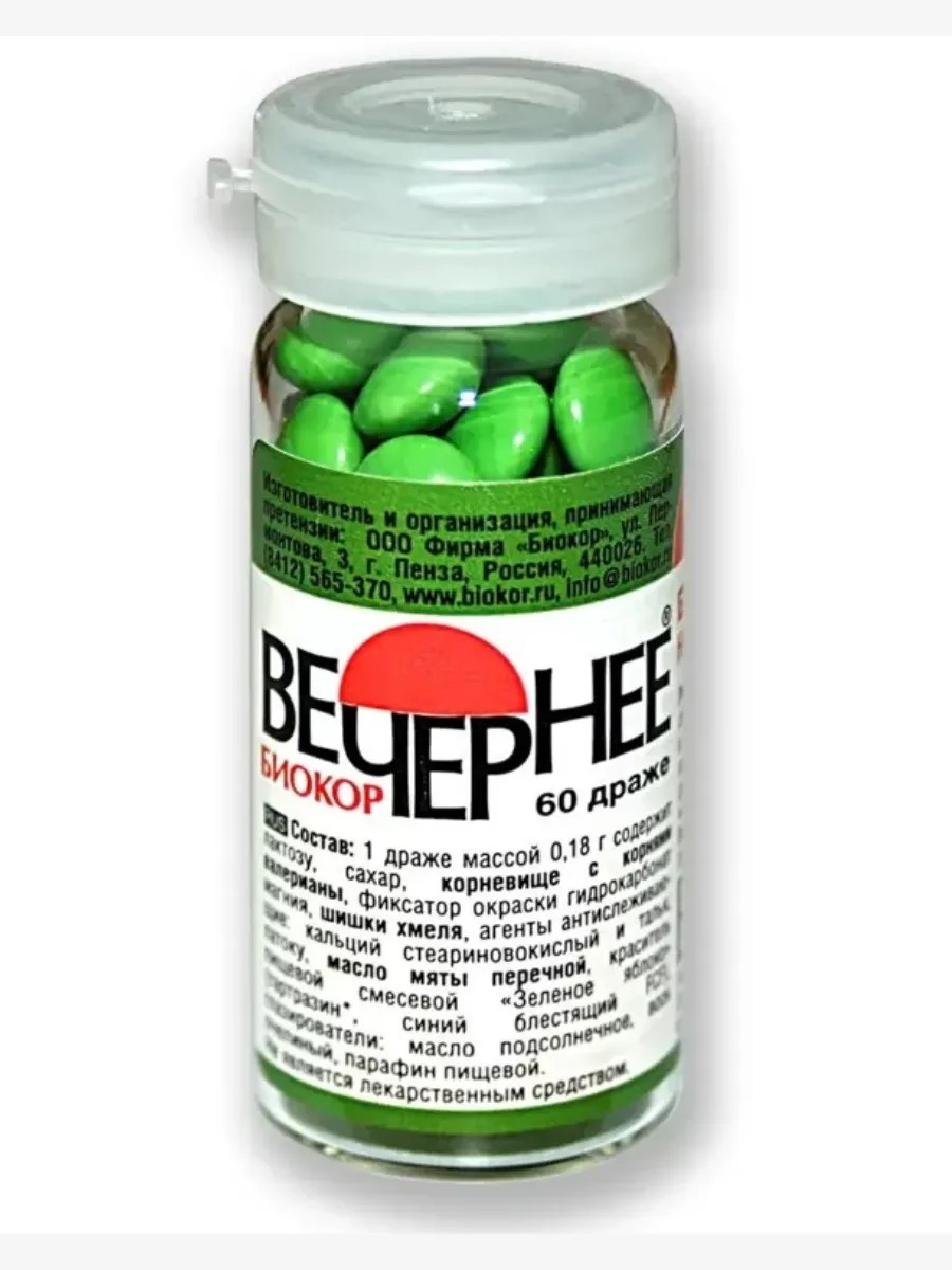 | Trade Name | biologically active food supplement "Evening + Motherwort Biocor" (dragee weighing 0.16 g) |