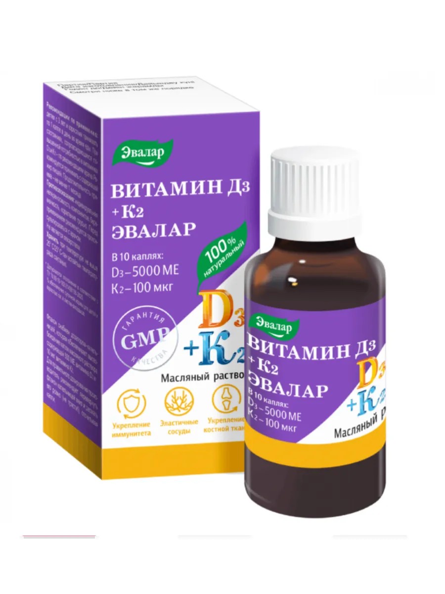 Витамин Д3 500 МЕ + К2 капли - масляные капли с витаминами D3 и K2. Усиливают усвоение кальция, предотвращают его отложение в сосудах. Для детей и взрослых. Витамин Д3 500 МЕ + К2 в каплях от компании «Эвалар» содержит популярный витамин D, усиленный натуральным витамином К2, который дополняет действие витамина D и помогает ему лучше усваиваться. Витамин Д3 500 МЕ + К2 способствует укреплению иммунитета, нормализации кальциевого обмена - направляет кальций в костные ткани, препятствуя его отложению в сосудах (безопасное усвоение кальция), повышению эластичности сосудов, предотвращению кальцификации тканей (снижению скорости старения), поддержанию здоровья костей, зубов.