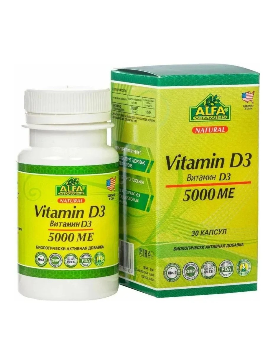 Vitamin D3 5000IU from the American brand Alfa Vitamins helps replenish insufficient cholecalciferol levels in the body.
