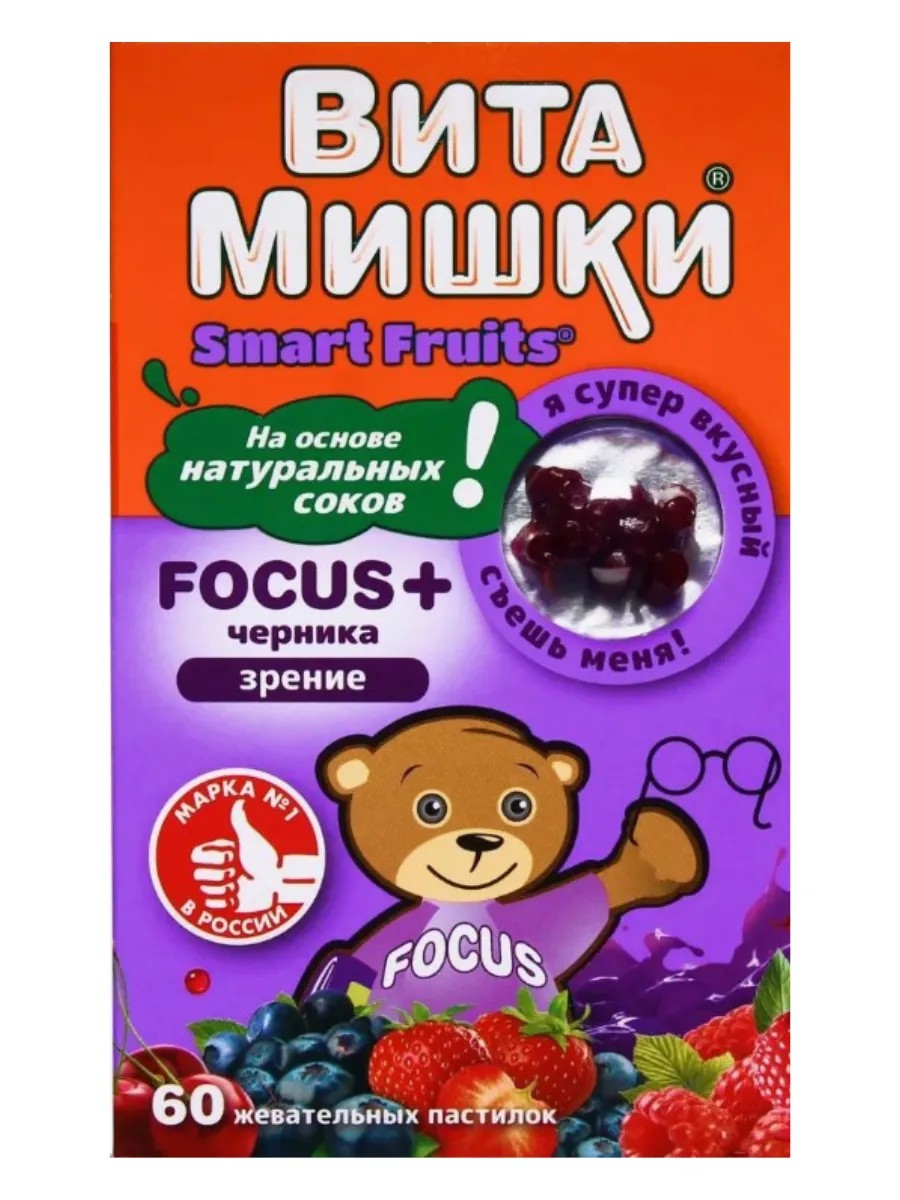 ВитаМишки Focus + черника - сбалансированный витаминно-минеральный комплекс в виде вкусных мармеладных пастилок в форме фигурок мишек с вишневым, малиновым, клубничным, черничным вкусами.