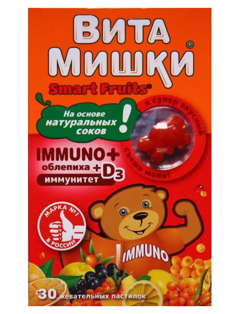 ВитаМишки Immuno + облепиха - сбалансированный витаминно-минеральный комплекс в виде вкусных мармеладных пастилок-мишек с натуральными фруктовыми и овощными экстрактами для детей с 3-х лет.