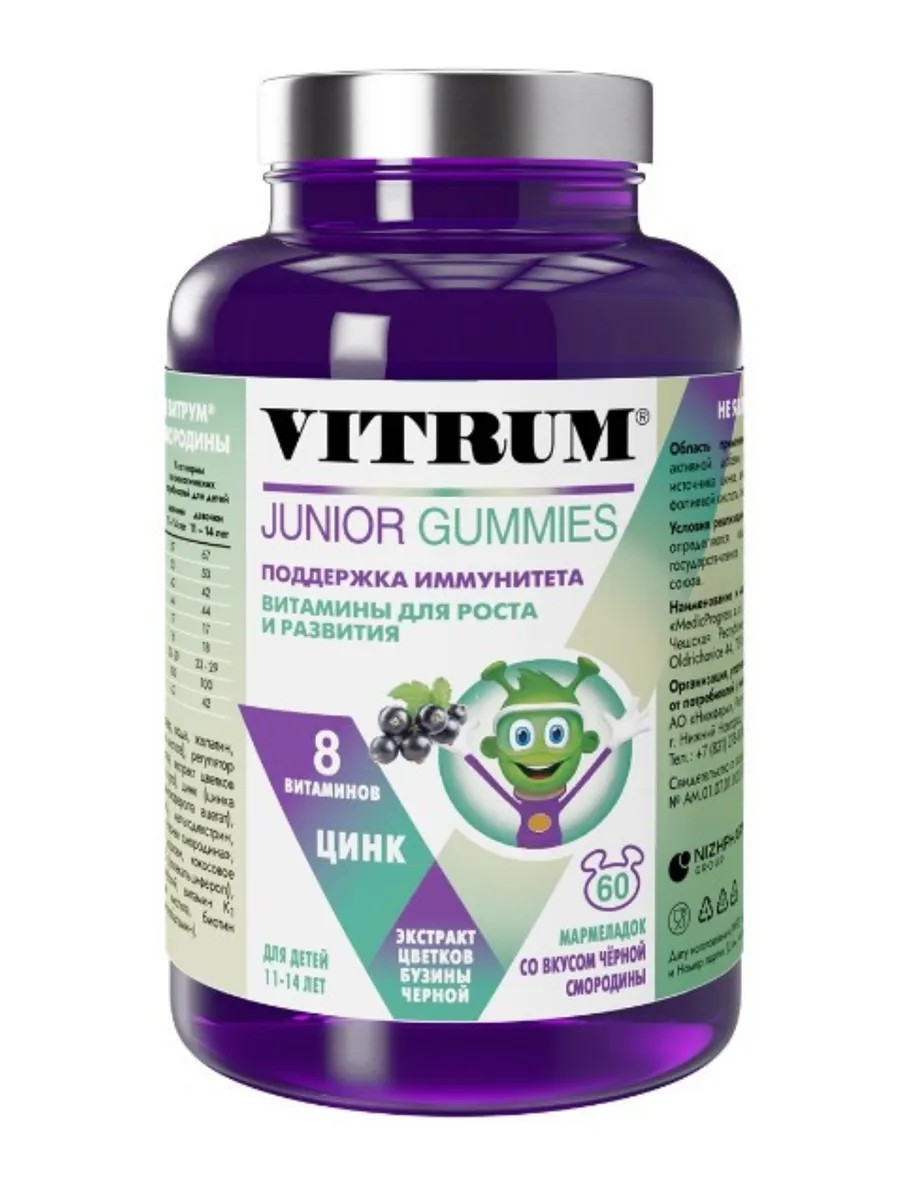 Vitrum Junior, blackcurrant-flavored gummies, 60 pcs - a vitamin and mineral complex for children, contains 8 vitamins, zinc and black elderberry flower extract for daily support of the child's immunity. The complex is intended to replenish the lack of vitamins and minerals in children aged 11-14 years.