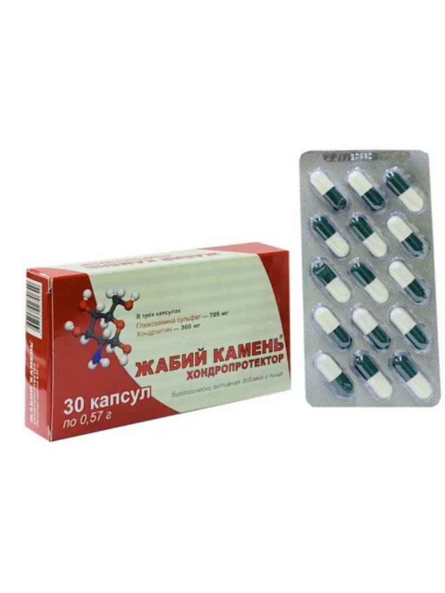 Жабий камень хондропротектор - это биологически активная добавка (БАД) к пище, которая помогает улучшить состояние суставов. Продукт содержит глюкозамин и хондроитин. Эти вещества способствуют восстановлению хрящевой ткани и предотвращению их разрушения, уменьшению боли и улучшения подвижности суставов. Жабий камень хондропротектор может быть полезен для людей с остеоартрозом и другими заболеваниями суставов, а также для предупреждения этих заболеваний у людей, которые испытывают повышенную нагрузку на суставы. Каждая упаковка содержит 30 капсул для приема внутрь. Принимать взрослым и детям старше 14 лет по 1 капсуле 3 раза в день во время еды Продолжительность приема: 1 месяц. Не является лекарством. Перед применением рекомендуется проконсультироваться с врачом. Глюкозамина сульфат, входящий в состав препарата, является питательным веществом для хондроцитов (клеток, образующих суставной хрящ). Кроме того, способствует выработке молекул протеогликанов, удерживающих жидкость в хрящевой ткани.