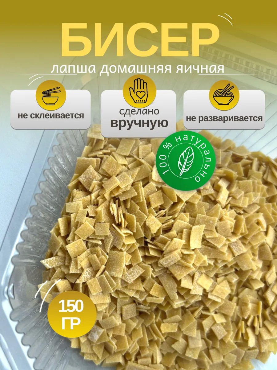 Лапша домашняя «Бисер» — это настоящий вкус домашнего уюта. Изготовленная вручную из натуральных ингредиентов, она станет основой для приготовления разнообразных блюд. Продукция обладает высокой пищевой ценностью и включает в себя полезные углеводы и белок, что делает ее идеальной для диеты и здорового питания. Данная лапша изготовлена без использования ГМО, искусственных красителей и усилителей вкуса, что делает ее особенно привлекательной для людей, заботящихся о своём здоровье и предпочитающих натуральные продукты. Для хранения сушёной лапши мы используем герметичную упаковку (контейнеры), что позволяет сохранить ее свежесть и натуральные качества.