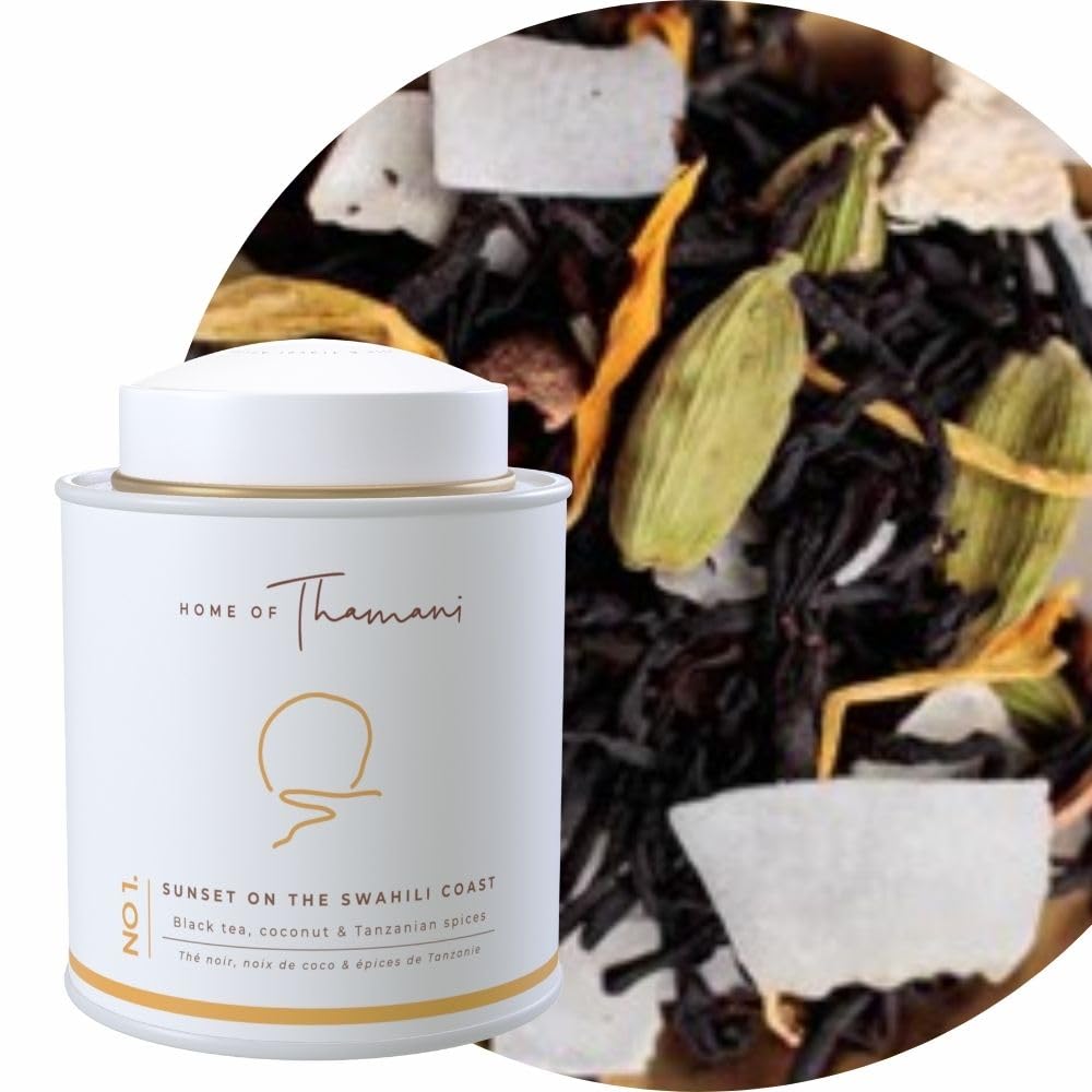 DESCRIPTION DU PRODUIT DESCRIPTION DU PRODUIT Experience the rich flavors of Swahili Tea by Home Of Thamani, a modern reinvention of traditional spiced chai. This unique blend combines Kenyan black tea, coconut, and Tanzanian spices for a tropical and spicy taste. Inspired by the vibrant Swahili culture of East Africa, each cup transports you to the shores of the Indian Ocean, where the traditions of African tea culture meet the enchanting beauty of a coastal sunset. Key Features: Unique Flavor Profile: A harmonious blend of Kenyan black tea (79 ), coconut (6.5 ), and select spices (cardamom, cinnamon, cloves, ginger - 11 ). Cultural Inspiration: A tribute to the rich Swahili culture, using locally sourced ingredients for an authentic experience. Versatile Preparation: Enjoy as a spiced chai tea or as a creamy chai latte with milk. High-Quality Ingredients: Made with natural flavors and marigold petals for a visually and aromatically pleg tea. Sustainable and Ethical: Locally sourced ingredients reflecting the Swahili coastal cuisine. Perfect for tea enthusiasts, chai lovers, and cultural explorers, this tea is also an excellent choice for health-conscious consumers seeking natural, high-quality tea options. INGRÉDIENTS Kenyan black tea (79 ), Coconut (6,5 ), Spices (cardamon, cinamon, cloves, ginger) (11 ), Naturals flavors, Marigold petals.Swahili Tea - Kenyan Black Tea, Coconut Tanzanian Spices - 50g - Inspired by Swahili Culture - Spiced Chai Tea - Gourmet Gift Idea (80) 80.0 GrammesDESCRIPTION DU PRODUIT DESCRIPTION DU PRODUIT Experience the rich flavors of Swahili Tea by Home Of Thamani, a modern reinvention of traditional spiced chai. This unique blend combines Kenyan black tea, coconut, and Tanzanian spices for a tropical and spicy taste. Inspired by the vibrant Swahili culture of East Africa, each cup transports you to the shores of the Indian Ocean, where the traditions of African tea culture meet the enchanting beauty of a coastal sunset. Key Features: Unique Flavor Profile: A harmonious blend of Kenyan black tea (79 ), coconut (6.5 ), and select spices (cardamom, cinnamon, cloves, ginger - 11 ). Cultural Inspiration: A tribute to the rich Swahili culture, using locally sourced ingredients for an authentic experience. Versatile Preparation: Enjoy as a spiced chai tea or as a creamy chai latte with milk. High-Quality Ingredients: Made with natural flavors and marigold petals for a visually and aromatically pleg tea. Sustainable and Ethical: Locally sourced ingredients reflecting the Swahili coastal cuisine. Perfect for tea enthusiasts, chai lovers, and cultural explorers, this tea is also an excellent choice for health-conscious consumers seeking natural, high-quality tea options. INGRÉDIENTS Kenyan black tea (79 ), Coconut (6,5 ), Spices (cardamon, cinamon, cloves, ginger) (11 ), Naturals flavors, Marigold petals.