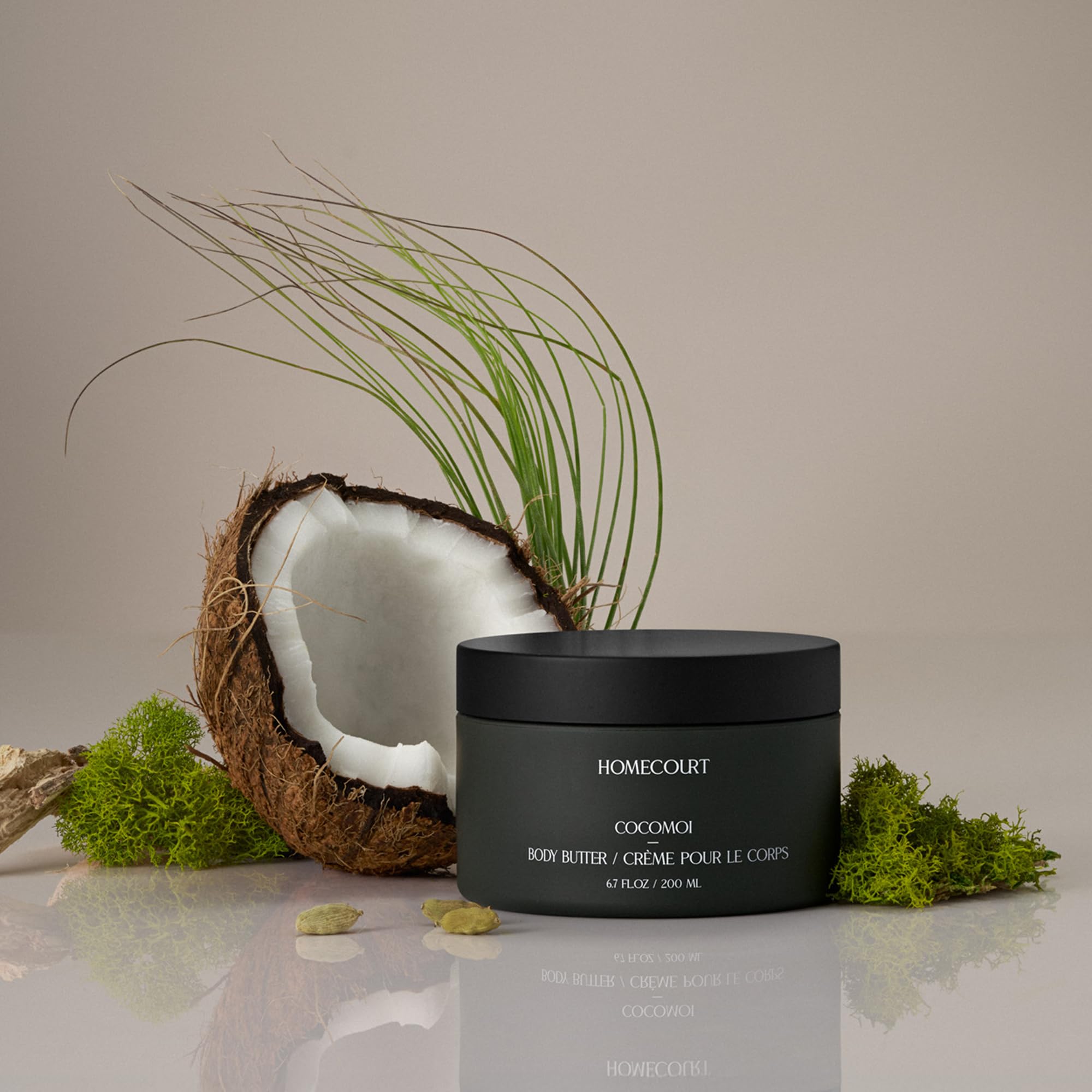 "A rich, indulgent cream that deeply nourishes, providing intense hydration and lingering fragrance. Featuring: Natural clay minerals to promote supple, smooth skin Shea Butter to moisturize and condition Organic rosella botanical extract to deeply hydrate skin for up to 72 hours Plant-sourced vitamin E to leave skin feeling silky smooth. Upcycled sugar beet extract to naturally moisturize Fragrance Notes: Cocomoi: An exotic blend of fresh coconut water, cedarwood, creamy fig, sweet cardamom, vetiver, and black pepper - inspired by the warm, grounded feeling of walking on the beach at sunset. Key Notes: Coconut Water Cedarwood Vetiver Sweet Cardamom Black Pepper Ingredients Packaging: This body butter is made with ingredients like natural clay minerals, shea butter, organic rosella botanical extract, plant-sourced vitamin E, and upcycled sugar beet extract. Our products come in 100 post-consumer recycled (PCR) bottles. Usage Instructions: Apply generously onto wet skin and massage into a rich lather. Rinse thoroughly. Founded by Courteney Cox, Homecourt was created with the idea that your home should be a sanctuary and caring for your space can be transformative. Our products are designed assembled in the USA. 100 vegan cruelty-free."BEAUTY PRODUCTS FOR THE HOME: Founded by Courteney Cox, Homecourt was created with the idea that your home should be a sanctuary and caring for your space can be transformative. Our products are designed assembled in the USA. 100 vegan cruelty-free. USAGE INSTRUCTIONS: For luxurious hydration, gently massage onto the skin until fully absorbed. ECO-FRIENDLY FORMULA: This body butter is made with ingredients like natural clay minerals, shea butter, organic rosella botanical extract, plant-sourced vitamin E, upcycled sugar beet extract, and packaged in a 100 post-consumer recycled (PCR) bottle. EXOTIC, GROUNDING SCENT: The Homecourt Body Butter in Cocomoi features an exotic blend of fresh coconut water, cedarwood, creamy fig, sweet cardamom, vetiver black pepper. Inspired by the warm, grounded feeling of a sunset walk on the beach. NOURISHING, HYDRATING MOISTRUIZER: A rich, indulgent cream that deeply nourishes, providing intense hydration and lingering fragrance. Deely hydrates skin for up to 72 hours, promotes supple skin, and leaves skin silky smooth. Great for all skin types.