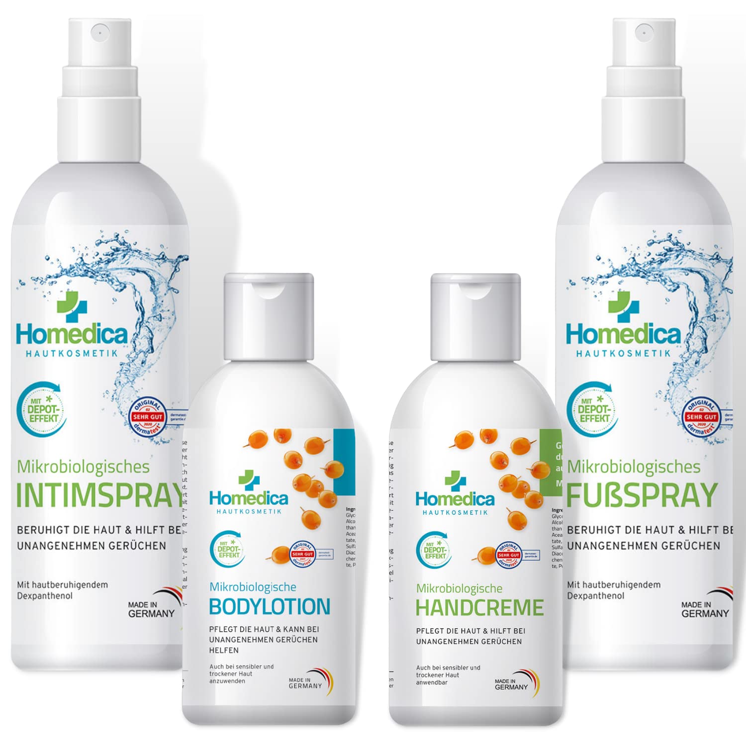 Contents of delivery: The Homedica Premium Body Care Kit includes 1 Homedica Microbiological Body Lotion, 1 Homedica Microbiological Intimate Spray, 1 Homedica Microbiological Hand Cream, and 1 Homedica Microbiological Foot Spray. Rated "very good" - Our products have undergone rigorous testing by Dermatest. All components of our Premium Care Kit (body lotion - 02.2020, intimate spray - 02.2020, foot spray - 02.2020, and hand cream - 02.2020) have passed this test. Trust in Homedica's years of experience - We stand for certified quality. Gentle care: The sea buckthorn oil used in our products is particularly rich in vitamins. The saturated fatty acids in the oil have a regenerative effect on the skin, hair, and nails. Furthermore, sea buckthorn oil increases the tone of connective tissue, absorbs moisture into the skin, and prevents premature skin aging. It is also suitable for sensitive and dry skin. It neutralizes 95 of skin odors – Homedica care creams contain a blend of sea buckthorn oil and microbacteria. Homedica care sprays, in addition to their microbiological properties, contain the soothing provitamin B5, also known as dexpanthenol. Our creams and sprays simultaneously neutralize and eliminate approximately 95 of organic skin odors that can be caused by contact with fish or onions. Long-lasting – Once applied, Homedica body sprays and care creams are fully absorbed within one minute and protect your skin barrier. Thanks to its long-lasting effect of up to 14 hours in hand cream and body lotion, and 6 hours in foot cream, the intimate spray helps keep skin protected and cared for for an extended period. We recommend regular use.HOMEDICA Crème pour les mains - Crème microbiologique - Sans odeurs désagréables - Crème neutralisante des odeurs - Testé dermatologiquement, végétalien et fabriqué en Allemagne (PremiumMixPack Body 2)Contenu de la livraison : le kit de soins pour le corps Homedca Premium comprend 1 lotion pour le corps microbiologique Homedica, 1 spray intime microbiologique Homedica, 1 crème pour les mains microbiologique Homedica et 1 spray pour les pieds microbiologique Homedica. Test noté « très bien » - Nos produits ont été soumis à des tests et des tests rigoureux de Dermatest. Tous les composants de notre kit de soins Premium (lotion pour le corps - 02.2020, spray intime - 02.2020, spray pour les pieds - 02.2020 et crème pour les mains - 02.2020). Faites confiance aux années d'expérience de Homedica - Nous sommes synonymes de qualité certifiée. Entretien doux : l'huile d'argousier utilisée dans nos produits est particulièrement riche en vitamines. Les acides gras saturés de l'huile ont un effet régénérant pour la peau, les cheveux et les ongles. En outre, l'huile d'argousier augmente la tonicité du tissu conjonctif, absorbe l'humidité à la peau et prévient le vieillissement prématuré de la peau et convient également aux peaux sensibles et sèches. Neutralise 95 des odeurs de la peau - Les crèmes de soin Homedica contiennent un mélange d'huile d'argousier et de microbactéries. Les sprays de soin Homedica disposent en plus de leurs propriétés microbiologiques, de la provitamine apaisante B5, également appelée dexpanthénol. Nos crèmes et sprays neutralisent et éliminent en même temps environ 95 des odeurs organiques de la peau qui peuvent être causées par le contact avec le poisson ou les oignons. Longue durée - Une fois appliqué, les sprays corporels et les crèmes de soin Homedica pénètrent complètement en une minute et protègent votre barrière cutanée. Grâce à un effet de dépôt allant jusqu'à 14 heures dans la crème pour les mains et la lotion pour le corps et 6 heures pour les pieds - et le spray intime permet à la peau de rester protégée et entretenue pendant longtemps. Nous vous recommandons une utilisation régulière.