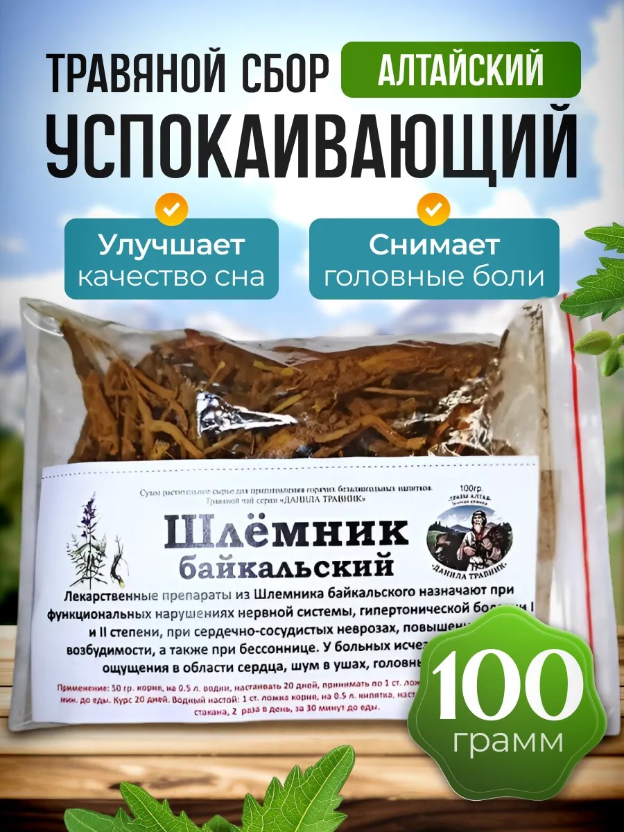 Manufactured by Danila Travnik, Belokurikha, Altai Krai. Baikal skullcap is prescribed for functional disorders of the nervous system, stage I and II hypertension, cardiovascular neuroses, increased excitability, and insomnia. Patients experience relief from heart pain, tinnitus, and headaches. Directions: Add 2 tablespoons of the mixture to 0.5 liters of boiling water and let steep for 30 minutes (brew and steep in a thermos). Drink 1 glass 2 times a day, 30 minutes before meals. A wonderful New Year's gift for yourself and loved ones!
