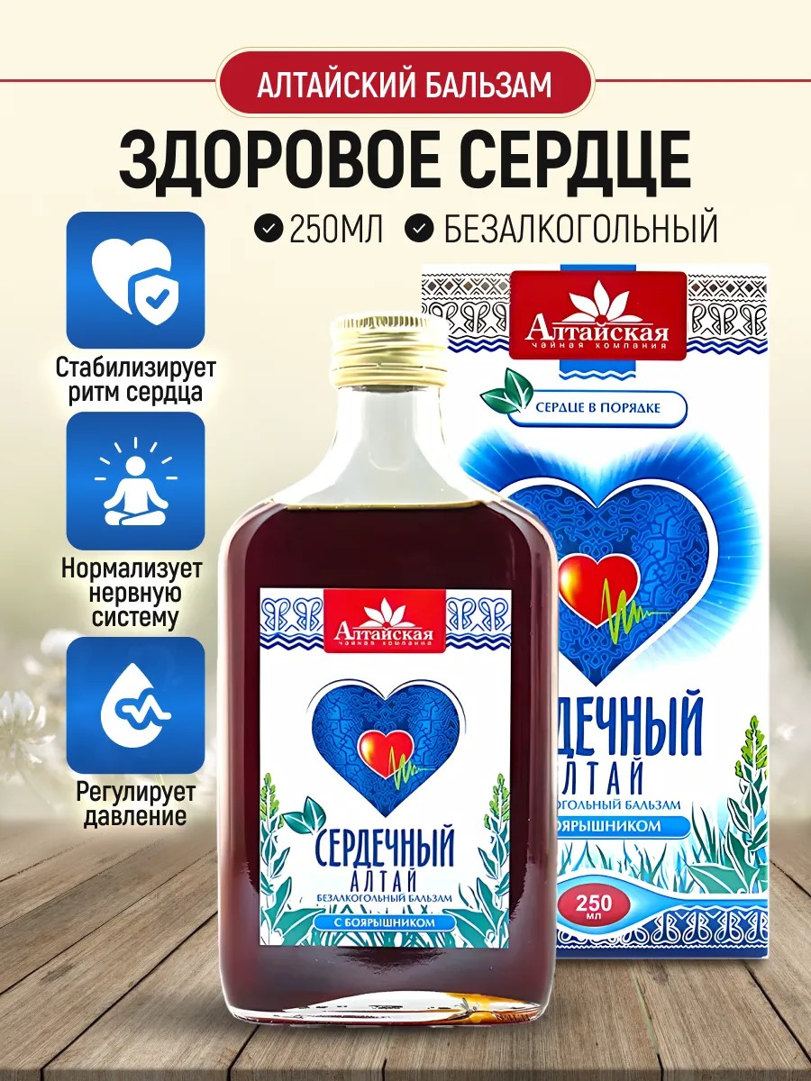: Бальзам Сердечный Алтай с добавлением боярышника создан для поддержания здоровья сердечно-сосудистой системы и общего самочувствия. Боярышник славится своими полезными характеристиками: он помогает при проблемах с сердцем, улучшает кровообращение в мозговых сосудах и способствует снижению нервной возбудимости. Этот бальзам также эффективно устраняет умственную и физическую усталость, но результат может различаться в зависимости от индивидуальных особенностей организма.