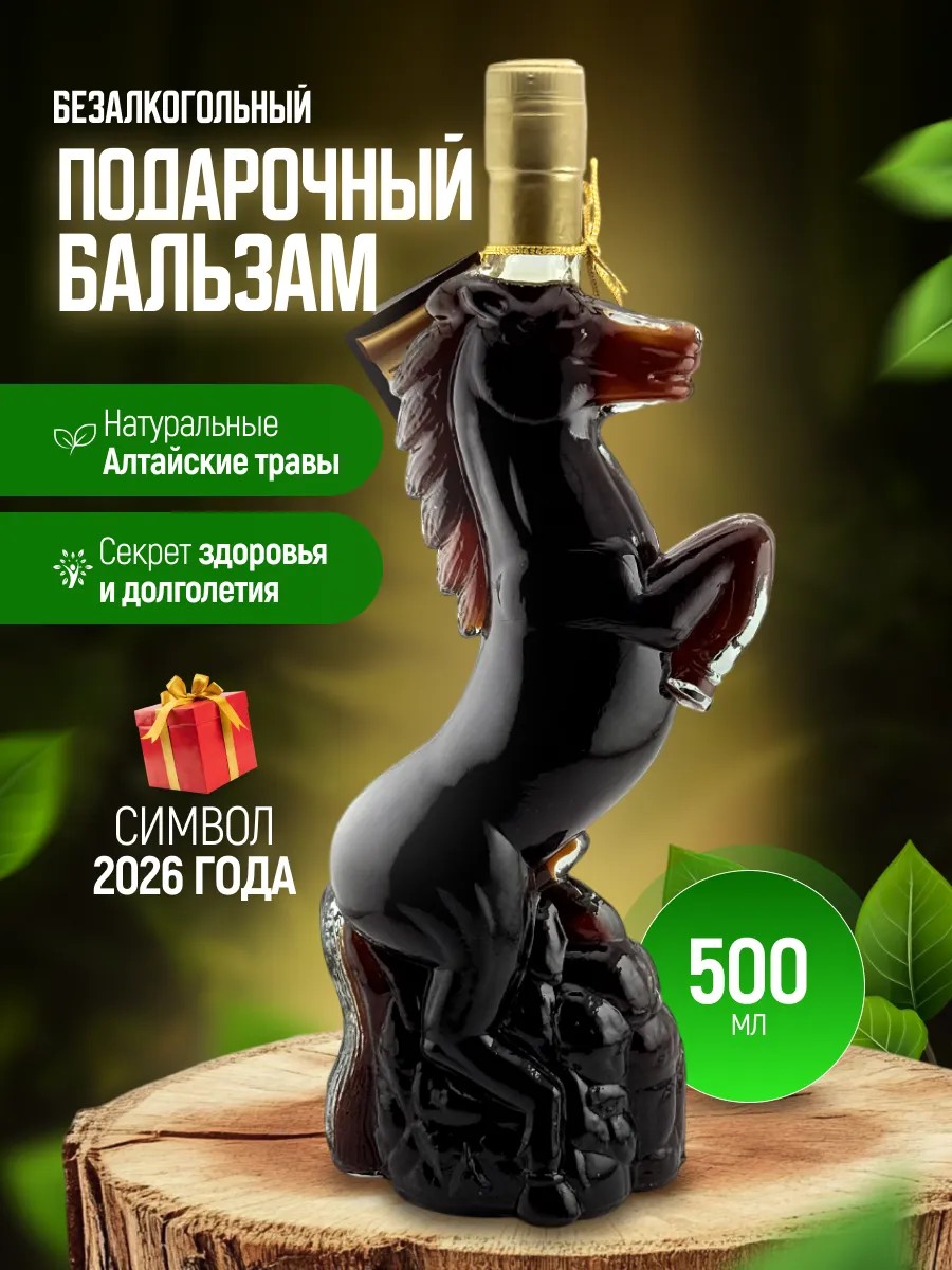 The non-alcoholic "Standing Horse" balm is a versatile and effective way to improve your health. Its complex of active ingredients improves blood formation and memory, positively impacts metabolism and cardiovascular function, and helps combat internal diseases and fatigue. This herbal drink contains many beneficial vitamins essential for the body. It improves blood composition, has an antimicrobial effect, and normalizes gastrointestinal function. This natural Altai tincture, made from a blend of herbs, has a pleasant, tart flavor. Due to the tannins, the syrup is quite viscous. The balm stimulates the immune system, invigorates, increases productivity, and helps relieve colds. It is also used for cancer prevention. This delicious vitamin-rich product is used for inflammatory diseases of the oral mucosa and skin lesions. It stops bleeding, enhances sexual potency, and promotes hair growth. This healthy diet helps prolong a man's longevity by stimulating cell regeneration and activating the body's defenses. The product is sold in a beautiful glass bottle, making it a perfect gift for any occasion: birthday, New Year's, February 23rd, anniversary, or special occasion. This symbol of the year is a great gift for a grown man: dad, beloved brother, boyfriend, husband, best friend, grandfather, colleague, or homeroom teacher. Delight your family and give him this cool gift for a real man. A wonderful New Year's surprise for yourself and your loved ones!