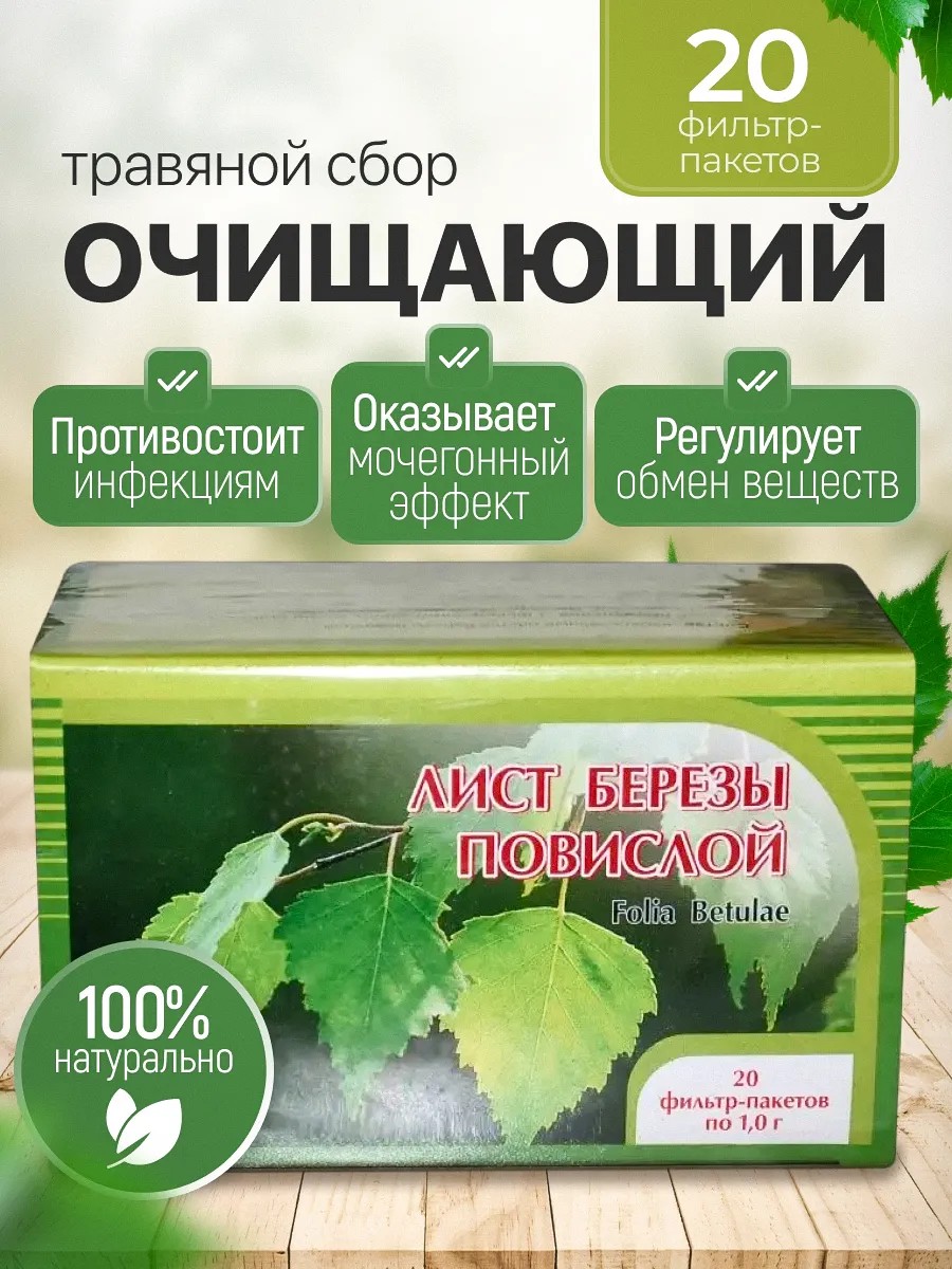 Листья березы богаты органическими кислотами и эфирными маслами. Содержат дубильные вещества, сапонины, кумарины и многие другие полезные компоненты и минеральные элементы.Обладают потогонным, кровоочистительным, отхаркивающим, противосудорожным, мочегонным эффектом. Успешно противостоит грибковой инфекции.Наружно используются в виде компрессов при ранах, для больных суставов, облегчения болей при подагре.Помогают регулировать обмен веществ, являются противоглистным средством. Дезинфицируют желудочно-кишечный тракт, выводят вредные соли, продукты гнилостного распада, токсины. Противостоят воспалениям и инфекциям мочеполовой системы.Способ применения1 фильтр-пакет заварить стаканом кипятка, настаивать 15-25 минут. Пить 2 раза в день во время еды по 1/2 стакана. Курс - 1 месяц.ПротивопоказанияГепатиты, обострение язвенной болезни, гипертония, беременность, кормление грудью, наличие мочевых и желчных камней.Данная продукция не является лекарственным средством.