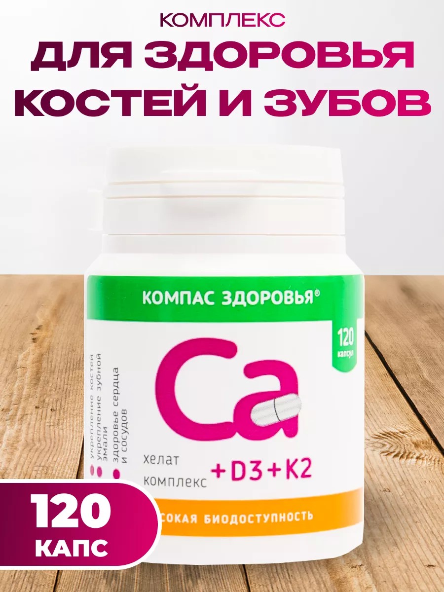 Капсулы «Кальций + Д3 + К2» – надежный источник минералов и витаминов. Витаминный комплекс «Ca + D3 + K2» представлен в биодоступной хелатной форме, которая полностью усваивается организмом. Курс приема кальций хелат 30 дней (120 капсул). Сертифицированная продукция (СГР). В составе самые биодоступные виды минерала: кальций цитрат и кальций бисглицинат. Витаминный комплекс усилен витаминами D3 и К2. Кальций в хелатной форме готов к усвоению организмом, витамин Д3 помогает кальцию лучше усвоиться в желудочно-кишечном тракте и попасть в кровоток, витамин K2 обеспечивает поступление кальция в кости и зубы. Кальций концентрат важнейший макроэлемент организма. Норма кальция способствует укреплению и ускорению роста ногтевой пластины, регуляции метаболизма, профилактике остеопороза и переломов, снижению риска образования кариеса и пародонтоза, профилактике дряблости кожи и формированию морщин. Телу человека необходим кальцмй для осуществления обменных процессов. Он играет важнейшую роль в передаче нервных импульсов, регуляции артериального давления и свертывания крови. Кальций хелат для людей необходим, так как его дефицит приводит не только к разрушению костей, но и недомоганиям всего организма. Начните принимать капсулы кальций (таблетки кальций), если замечаете: 1. Недостаток минерала в пище 2. Сухие волосы, впадение волос 3. Ломкие ногти 4. Отсутствие энергии, утомляемость 5. Частые перепады настроения и стресс 6. Истончение зубной эмали 7. Пониженное давление 8. Спазмы, судороги, онемение, неприятные ощущения в суставах и мышцах. Рекомендуем принимать кальций д3 к2 после перенесенных травм и переломов, с сердечно - сосудистыми заболеваниями.
