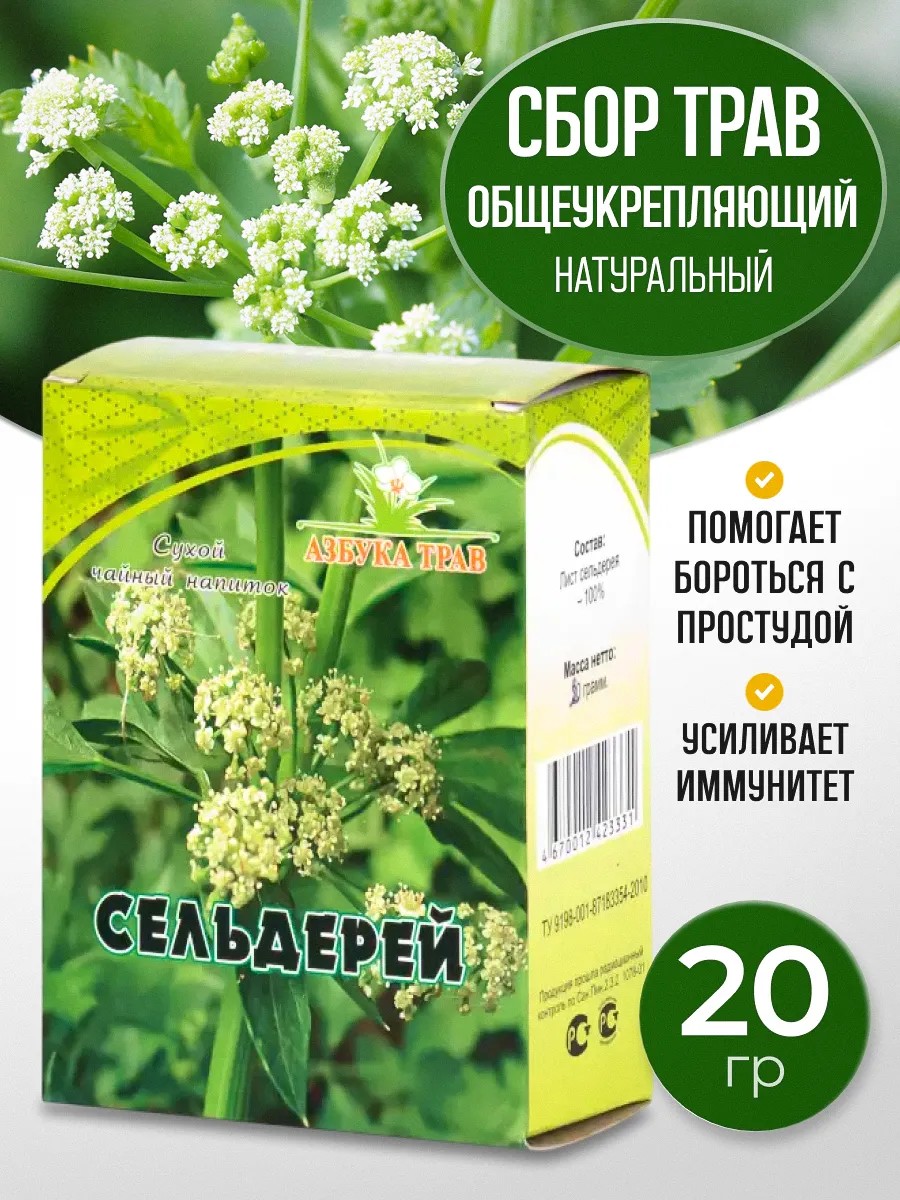 Профилактический чай из листа сельдерея содержит важнейшие витамины A, E, C, P, а также группы B, минеральные вещества: магний, калий, цинк, кальций, железо. Благодаря содержанию этих соединений и биологически активных веществ, сельдерей нормализует кровяное давление, предотвращает развитие раковых заболеваний, нормализует гормональный фон, укрепляет иммунитет и помогает бороться с простудой. Обладает седативным эффектом: снимает напряжение, раздражительность и стрессы. Очищает организм от токсинов, способствует выведению шлаков, улучшает состояние при сахарном диабете, нормализует водно-солевой баланс, выводит лишние соли. Противопоказания Индивидуальная непереносимость компонентов. Способ применения Заварить в теплой воде. Состав Сельдерей (лист, 20 грамм)