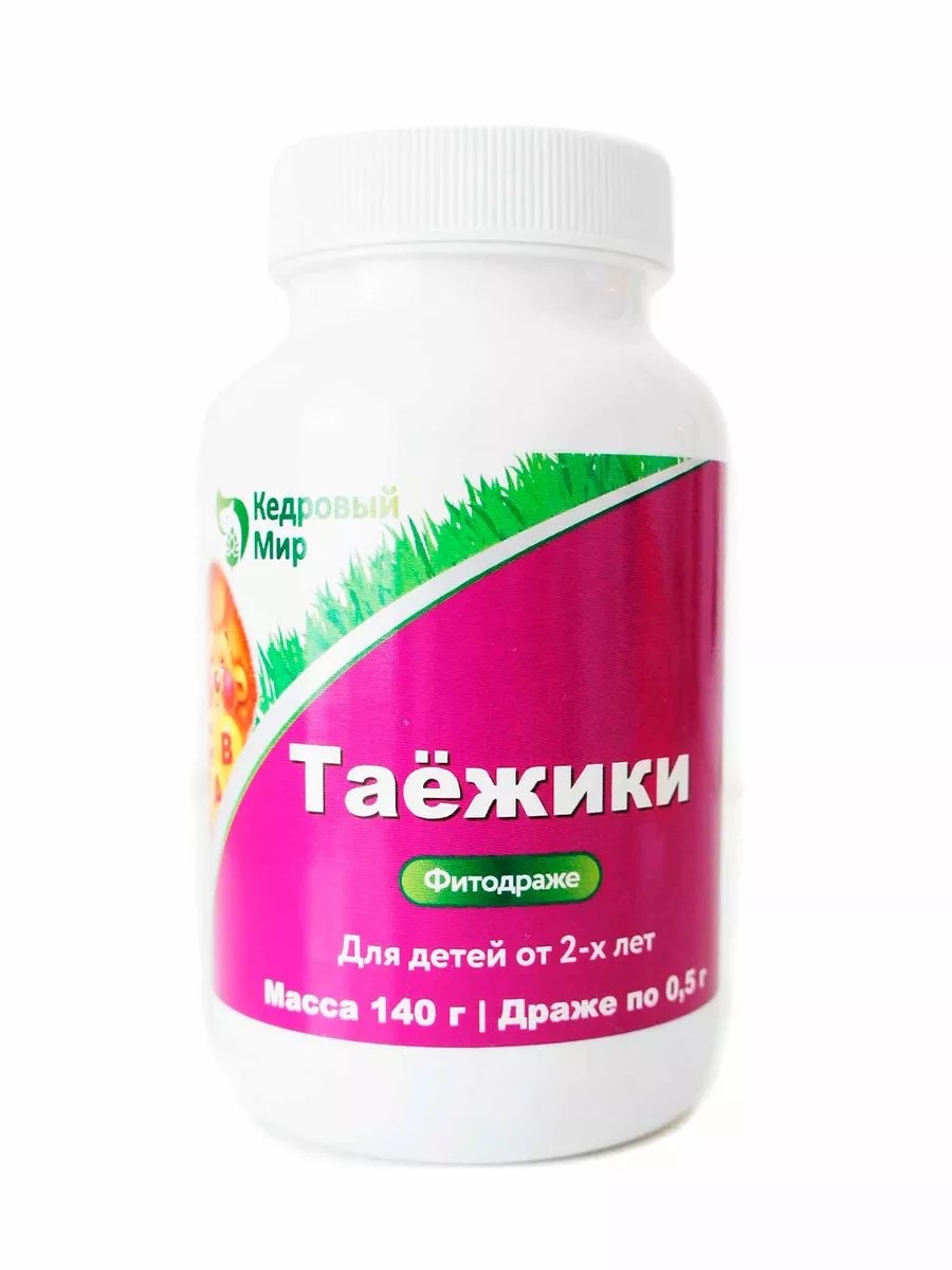 Для того чтобы предохранить ребёнка от инфекционных заболеваний, помочь ему лучше учиться, стать здоровее были созданы детские драже «Таёжики». В их состав входят: шиповник, живица кедровая, ромашка, золотой корень, мёд, кедровый белок, микродозы пчелозана (хитозан из пчёл). Объединение мощных природных сил кедра, трав, меда встанет щитом на пути болезней и чудесным образом поможет детям расти здоровыми, умными, энергичными Детям от 4-х до 12 лет: 2 драже в день утром Детям старше 12 лет и взрослым: 4 драже Хранить в сухом месте при комнатной температуре.