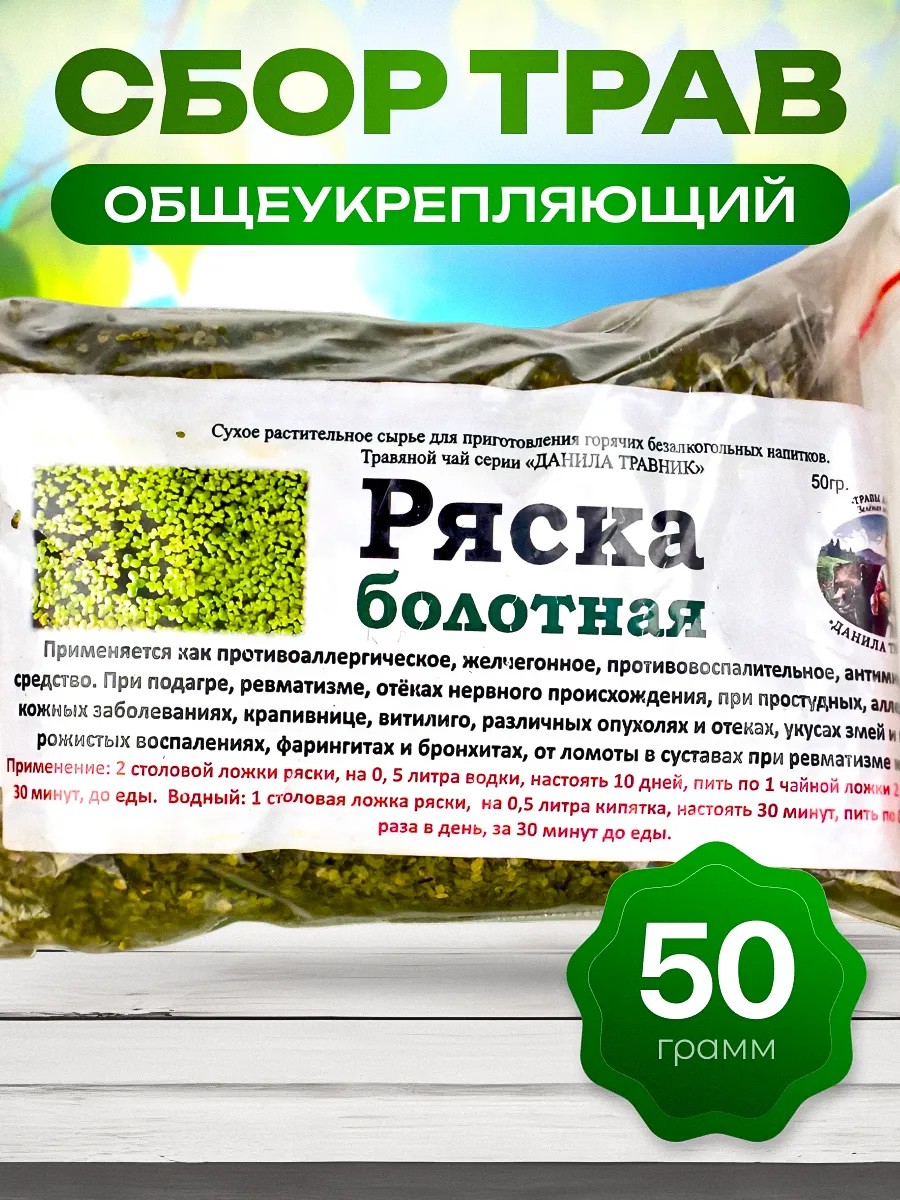 Ряска болотная трава Данила Травник 50 гр. Об удивительных свойствах ряски было известно уже много веков назад. Это ценный подарок природы, оказывающий благотворное воздействие на многие органы и системы организма человека. В народной медицине ее используют как в свежем, так и в высушенном видедля приготовления отваров, настоек, мазей, помогающих при лечении многих недугов: аллергии, отеков, пиелонефрита, ревматизма, подагры, витилиго, астмы, глаукомы. Ряска оказывает общеукрепляющее действие, помогает сохранить здоровье и отличное самочувствие. Назначение: Применяется как противоаллергическое, желчегонное, противовоспалительное, антимикробное средство. При подагре, ревматизме, отёках нервного происхождения, при простудных, аллергических и кожных заболеваниях, крапивнице, витилиго, различных опухолях и отеках, укусах змей и насекомых, рожистых воспалениях, фарингитах и бронхитах, от ломоты в суставах при ревматизме и подагре. Применение: Спиртовой:2 столовой ложки ряски на 0.5 литра водки, настоять 10 дней. Пить по 1 чайной ложке 2 раза в день, за 30 минут до еды. Водный:1 столовая ложка ряски на 0.5 литра кипятка, настоять 30 минут. Пить по 0.5 стакана 2-3 раза в день, за 30 минут до еды. Если нет медицинских противопоказаний, рациональней воспользоваться спиртовым способом применения. Дело в том, что при таком способе больше действующих веществ сохраняется в настое. Благодаря этому одной порции хватает на более продолжительный курс лечения. Разовая доза лекарства на спирту меньше чем на воде, что облегчает приём Состав:цельные листики ряски болотной Срок годности: 24 мес. Не является лекарственным средством. Замечательный новогодний подарок для себя и близких!