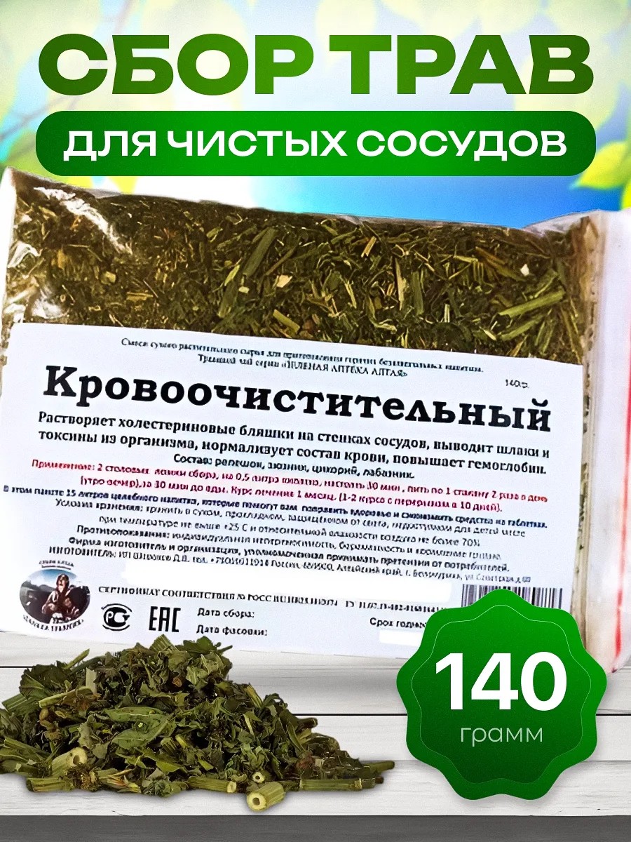 The Blood Purifying Collection is a harmless blood cleanser with herbal remedies that initiates the process of cellular rejuvenation and slows the natural aging process. This complex of Altai herbs promotes the dissolution of cholesterol deposits on the walls of blood vessels, removes accumulated toxins and free radicals, improves blood composition, and normalizes hemoglobin levels. High levels of waste and toxins, pharmaceutical residues, allergens, nicotine, and alcohol in the blood weaken its protective properties, reduce immunity, and therefore health. Purpose: dissolves cholesterol plaques on the walls of blood vessels, removes waste and toxins from the body, normalizes blood composition, and increases hemoglobin. Directions: Add 2 tablespoons of the collection to 0.5 liters of boiling water, let it steep for 30 minutes, and drink 1 glass twice a day (morning and evening), 30 minutes before meals. The course of treatment is 1 month (1-2 courses with a 10-day break). This is not a medicine. A wonderful New Year's gift for yourself and your loved ones!