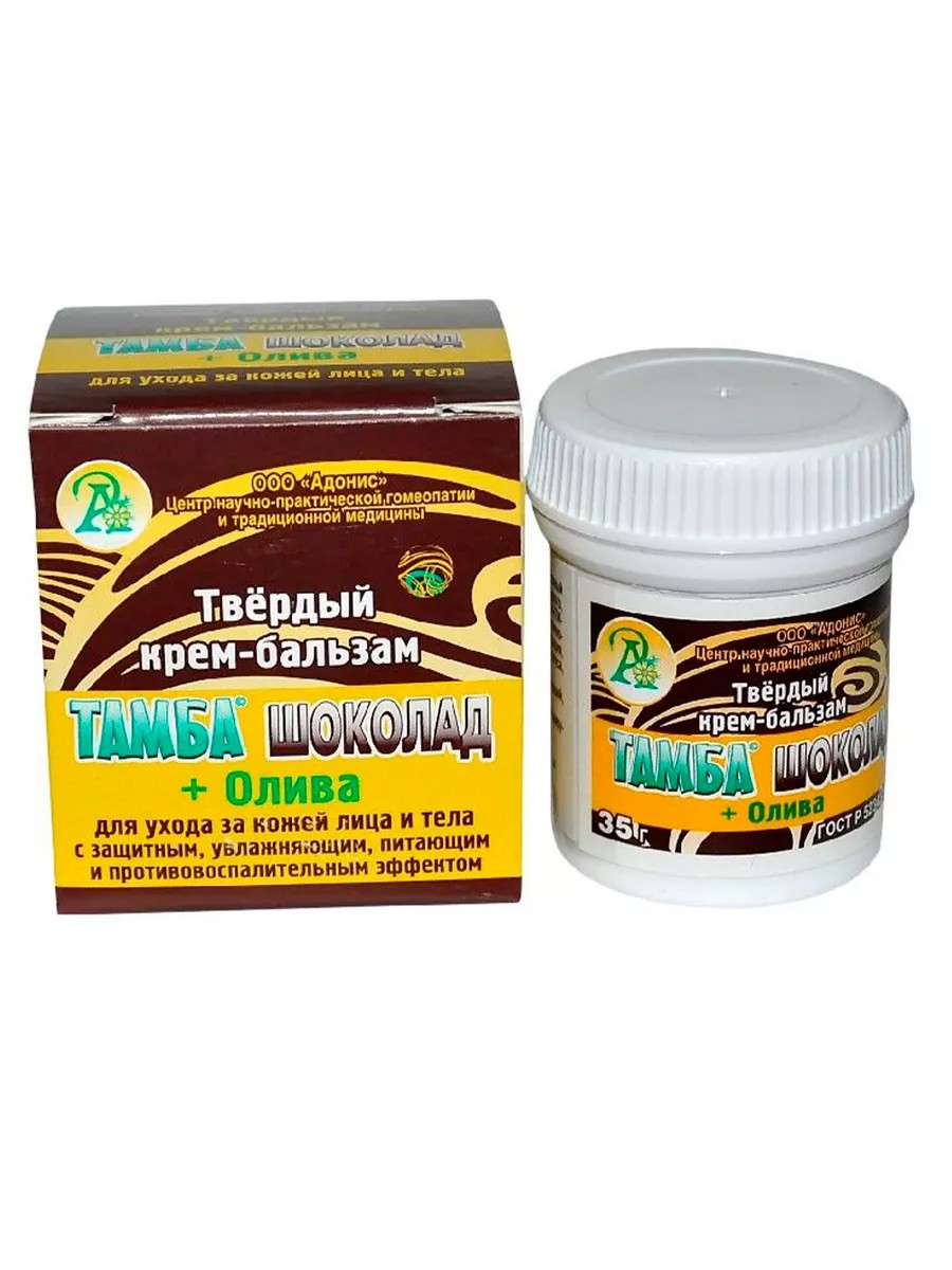 Твёрдый крем-бальзам «ТАМБА ШОКОЛАД» + Олива применяется для ухода за кожей лица и тела, с защитным, увлажняющим, питающим и противовоспалительным эффектом. Его действие обусловлено специфическими особенностями натуральных компонентов, уникальной технологией изготовления, подбором составляющих с учётом их индивидуального воздействия на кожу и её функции.Эффект «атласно-бархатной» кожи проявляется уже при однократном применении и сохраняется даже после водных процедур, уже через минуту после нанесения кожа становится гладкой и приятно шелковистой. Зона нанесения: лицо, зона декольте, тело, руки, ступни. Тип кожи: рекомендуется для всех типов кожи, особенно подходит для сухой шелушащейся кожи, а также для антицеллюлитного массажа. Конечный результат: СМЯГЧЕНИЕ, УВЛАЖНЕНИЕ, АНТИЦЕЛЛЛИТНЫЙ ЭФФЕКТ, питание кожи, повышение её упругости и эластичности, нормализация липидного обмена, улучшение кровообращения, регенерация, снятие раздражения, гладкость, матирующий эффект, увлажнение, повышение тонуса, омоложение. Эффект индивидуален. Состав: масло какао прямого холодного отжима (нерафинированное), масло оливковое холодного отжима (Eхtra Vergine) экстракт(концентрат) из лечебной грязи озера «Тамбукан», содержит 100% натуральное эссенциальное (эфирное) масло апельсина. Способ применения: наносить на кожу 1- 2 раза в день в виде аппликаций, «вбиваний» или массирующих втираний (по часовой стрелке). Рекомендации: для усиления эффекта КРЕМ-БАЛЬЗАМ «ТАМБА-ШОКОЛАД» Олива, рекомендуется использовать в сочетании с гранулами «Дерматон»; При уходе за «проблемной» кожей – с грязевыми масками «ТАМБА». Внимание! крем-бальзам 100% натуральный продукт, не содержавший химических консервантов. Его поверхность для защиты от испарения, высыхания, окисления, патогенной микрофлоры защищена слоем натурального пчелиного воска. Перед употреблением аккуратно удалите его с поверхности, чтобы крем-бальзам был более мягкий и удобен для нанесения. Данная продукция не является лекарственным средством