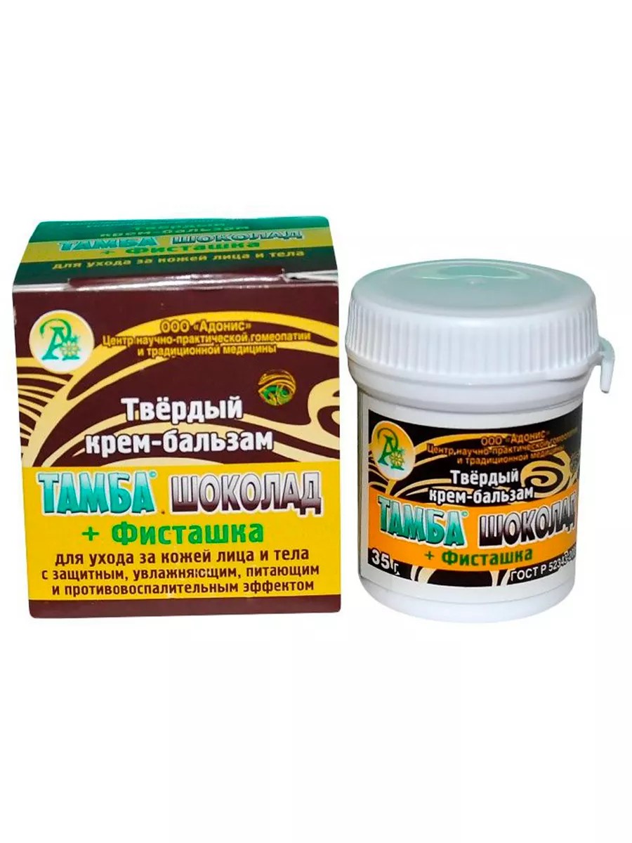 Твёрдый крем-бальзам «ТАМБА ШОКОЛАД» + Фисташка применяется для ухода за кожей лица и тела, с защитным, увлажняющим, питающим и противовоспалительным эффектом . Действие обусловлено специфическими особенностями натуральных компонентов, уникальной технологией изготовления, подбором составляющих с учётом их индивидуального воздействия на кожу и её функции. Эффект «атласно-бархатной» кожи проявляется уже при однократном применении и сохраняется даже после водных процедур, уже через минуту после нанесения кожа становится гладкой и приятно шелковистой. Масло фисташки очищает кожу от пигментных пятен и веснушек, лечит обморожение и трещины, укрепляет ногти и способствует росту волос, великолепно увлажняет кожу и поэтому является одним из лучших ингредиентов массажных масел для тела, применяется для чувствительной кожи и даже в детской косметике. Содержащиеся в фисташковом масле растительные стеролы восстанавливают эластичность кожи, и поэтому применяются в возрастной косметике для омоложения. Зона нанесения: лицо, зона декольте, тело. Тип кожи: рекомендуется для всех типов кожи, особенно подходит для омолаживающего массажа и применения до и после загара. Конечный результат: ОМОЛОЖЕНИЕ, ЗАЩИТА, смягчение, питание кожи, повышение её упругости и эластичности, нормализация липидного обмена, улучшение кровообращения, регенерация, снятие раздражения, гладкость, матирующий эффект увлажнение, повышение тонуса. Эффект индивидуален. Состав: масло какао прямого холодного отжима (нерафинированное), масло фисташек холодного отжима (Eхtra Vergine) экстракт(концентрат) из лечебной грязи озера «Тамбукан», содержит 100% натуральное эссенциальное (эфирное) масло лаванды. Способ применения: наносить на кожу 1- 2 раза в день в виде аппликаций, «вбиваний» или массирующих втираний (по часовой стрелке). Крем-бальзам 100% натуральный продукт, не содержавший химических консервантов.