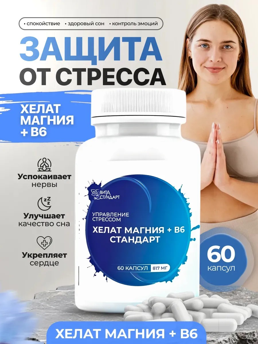 БАД «Хелат магния + В6 - Стандарт». Характеристики и отличительные особенности: -изготовлен из сырья высокого качества в виде капсул массой 817 мг.; -не содержит добавок, ароматизаторов, красителей; -носитель – микрокристаллическая целлюлоза; В 4-х капсулах продукта содержится 544 мг элементарного магния (136% от рекомендуемого уровня суточного потребления) и 6 мг витамина В6 (пиридоксина гидрохлорида). хелатная форма (бисглицинат магния) – это соединение Магния с остатком органической аминокислоты (глицином). Простыми словами — это ионы минерала, погруженные в белок и готовые к использованию и транспортировке клетками эпителия тонкой кишки, где происходит основной процесс усвоения. хорошо усваивается (до 90%) без побочных эффектов со стороны ЖКТ (не вызывает вздутия, запоров и диареи), так как имеет нейтральную кислотность и не раздражает слизистые оболочки; витамин В6 (пиридоксина гидрохлорид)участвует в более чем 100 биохимических реакциях человеческого организма: в клеточном метаболизме, синтезе гемоглобина, инсулина, некоторых половых гормонов; помогает снять стресс и усталость, облегчает состояние при заболеваниях суставов и сердца, положительно влияет на состояние центральной нервной системы; БАД «Хелат магния + В6 – Стандарт» разработан для поддержания спокойствия и здорового сна, способствуя укреплению нервной системы. В его состав входят магний и витамин B6, которые играют важную роль в регуляции нервных процессов и обеспечении полноценного отдыха. Регулярный прием этого комплекса может помочь уменьшить чувство тревоги, улучшить качество сна и повысить стрессоустойчивость; соответствует по показателям безопасности Техническому регламенту Таможенного союза "О безопасности пищевой продукции "ТР ТС021|2001", продукт сертифицирован. 1) Биологически активные вещества: Магний Содержание в 4 капсулах (суточной порции): 544 мг % от РУСП1: 136^2 2) Биологически активные вещества: Витамин В6 Содержание в 4 капсулах (суточной порции): 6 мг % от РУСП1: 300^2 Продолжительность приема: 1 месяц. При необходимости прием можно повторить. Противопоказания: индивидуальная непереносимость компонентов, беременность, кормление грудью. Перед применением рекомендуется проконсультироваться с врачом. Рекомендации по применению: принимать 1-2 раза в день во время еды, лучше перед сном. Дозировка подбирается индивидуально: от 2-х до 4-х капсул в сутки. Состав капсул: магния бисглицинат, оболочка капсулы (загуститель – гидроксипропилметилцеллюлоза), носитель – микрокристаллическая целлюлоза, пиридоксина гидрохлорид (витамин В6). Условия хранения: хранить в сухом, защищённом от прямых солнечных лучей, недоступном для детей месте при температуре не выше 25°С. Срок годности: 2 года.
