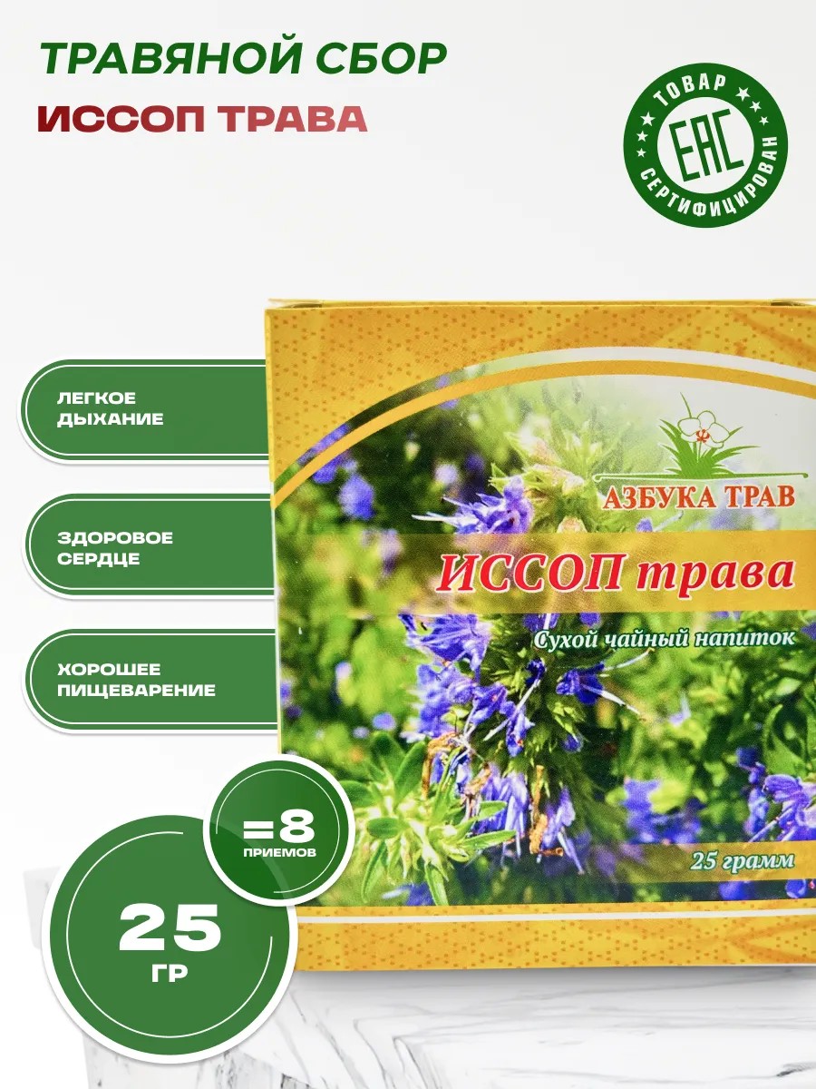 Состав: Иссоп трава - 100%. Комплектация 25 грамм сушенной измельченной травы в индивидуальной упаковке.