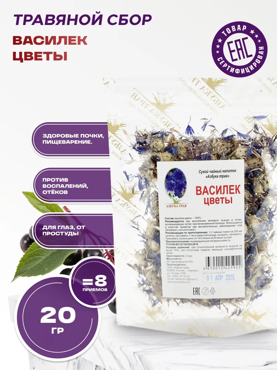 Откройте для себя целебную силу природы с нашим уникальным травяным сбором, где главные компоненты - василек и бузина. Этот рассыпной эликсир – настоящий кладезь здоровья, созданный самой природой.