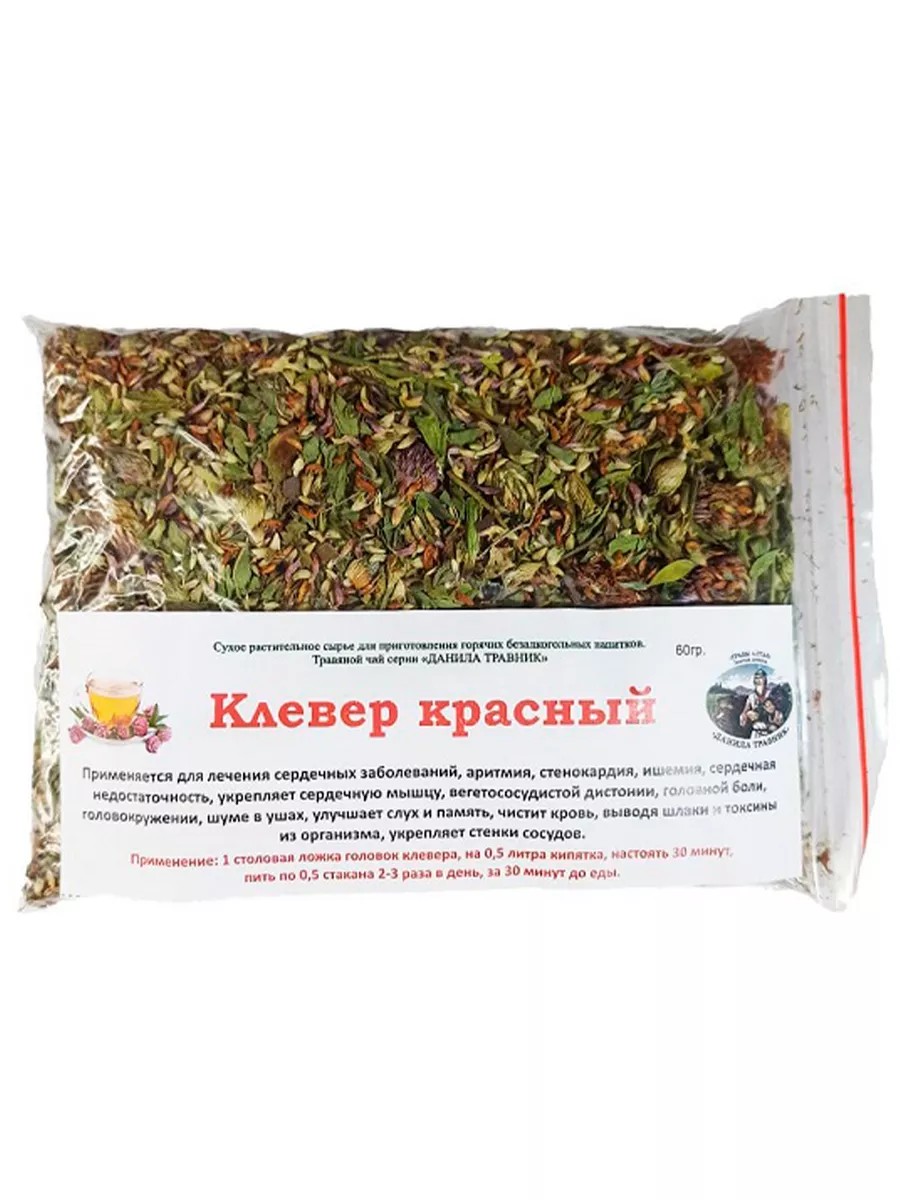 Применяется для лечения сердечных заболеваний, аритмия, стенокардия, ишемия, сердечная недостаточность, укрепляет сердечную мышцу, вегетососудистой дистонии, головной боли, головокружении, шуме в ушах, улучшает слух и память, чистит кровь, выводя шлаки и токсины из организма, укрепляет стенки сосудов. Применение:1 столовая ложка головок клевера, на 0.5 литра кипятка, настоять 30 минут, пить по 0.5 стакана 2-3 раза в день, за 30 минут до еды Состав: Клевер красный. Срок годности: 24 мес.