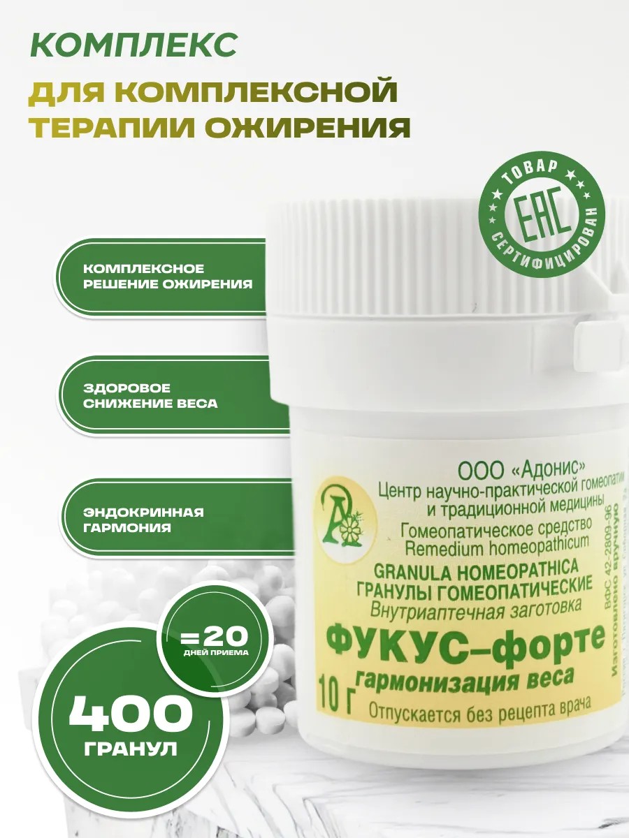 A homeopathic granulated multi-component remedy for the comprehensive treatment of obesity caused by endocrine, metabolic, digestive, and circulatory disorders, among others. Effectively eliminates side effects. Ingredients: Carduus marianus C3 (milk thistle) accelerates bile flow, improves liver function, eliminates venous congestion, and promotes rapid detoxification. Fucus in homeopathic dilutions D3 and C3 affects the endocrine system, eliminates iodine deficiency, and combats obesity, constipation, and nervous disorders associated with thyroid dysfunction. Pulsatilla C6 is prescribed for lethargy, malaise, hot flashes, eating disorders caused by overeating or consuming poor-quality, fatty foods, and digestive upset from cold foods, especially fruit. Directions: Dissolve 7 tablets sublingually half an hour before meals, twice daily, with a break of one day per week. Shelf life: 5 years. Contraindications: None. Each package contains 400 granules. This product is not a medicine.