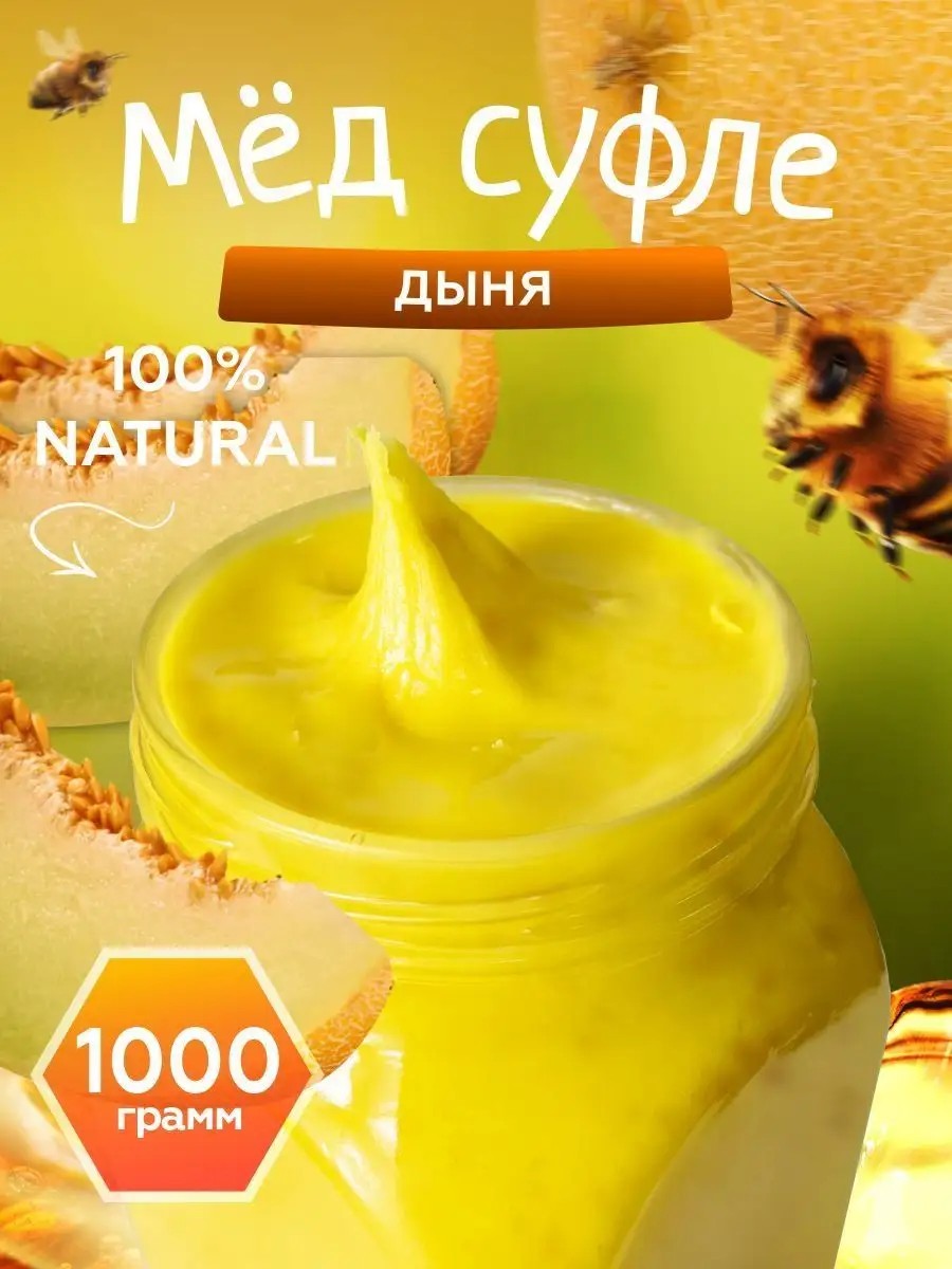 Мёд-суфле - это изысканное лакомство подарит чудесный, кружащий голову аромат, свежий вкус и богатый витаминный состав которого не оставят равнодушным даже самого взыскательного сладкоежку. Мёд-суфле производится из многократно взбитого мёда высочайшего качества. Он насыщается кислородом, избавляясь от приторности и превращаясь в нежнейшее кремовое лакомство, но сохраняя при этом все полезные свойства. Только натуральные добавки. Продукт готов к употреблению. Этот восхитительный продукт можно подарить вместо коробки конфет. Яркая изящная баночка выглядит как дорогой сувенир, а содержимое никого не оставит равнодушным.Наши покупатели сравнивают мед - суфле со вкусом мороженого, йогурта или мягкой нугой с дынным вкусом.Для профилактики ОРВИ, предотвращению сердечно -сосудистых заболеваний и повышения иммунитета, крем - мёдом мы подкармливаем своих детей и внуков. Наш крем мёд с дыней высоко оценили взрослые и дети! Мед – это вкусный источник энергии для людей, ведущих активный образ жизни. Потому что мёд содержит железо, которое отвечает за наполнение крови кислородом. Быстрая утомляемость наступает из-за нехватки железа в крови. Мед - суфле с дыней имеет густую консистенцию. Замечательный новогодний подарок для себя и близких!
