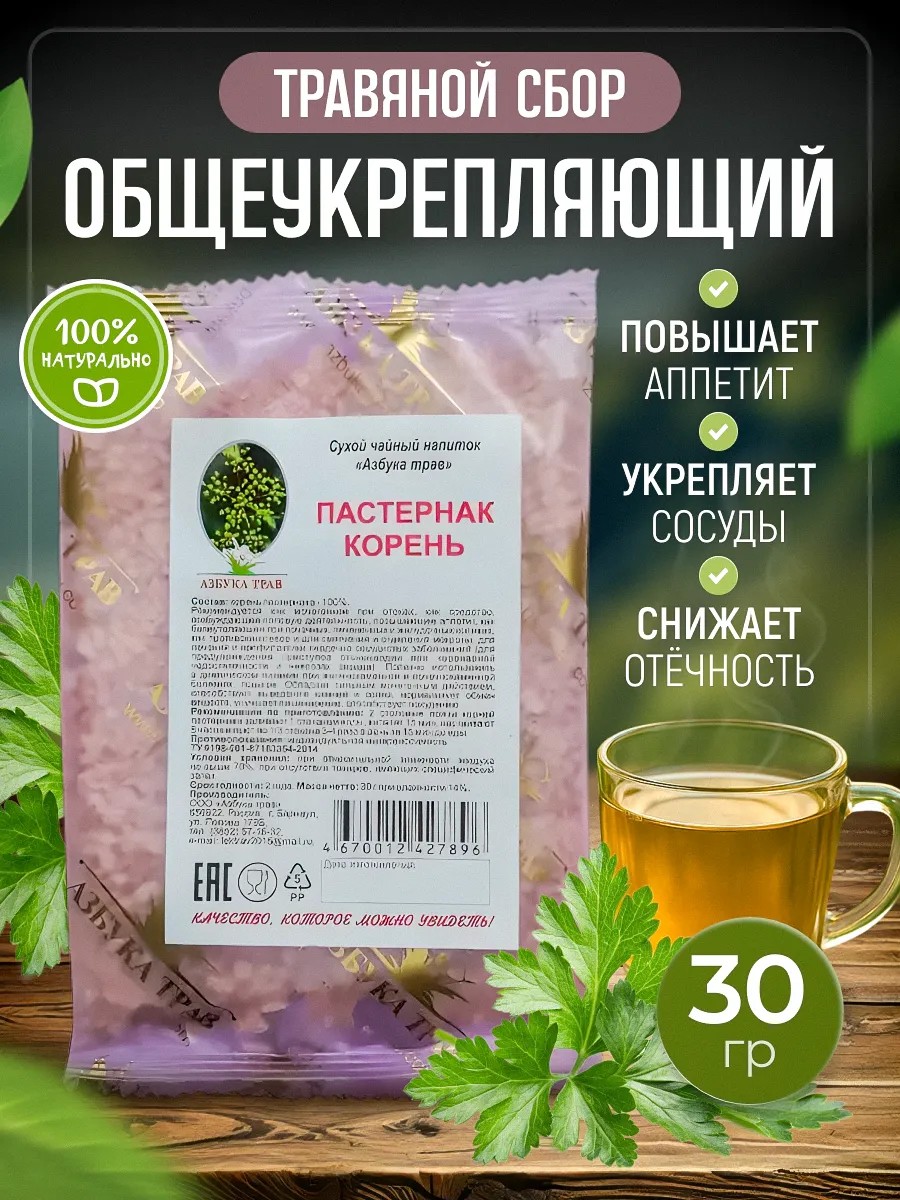 A preventative tea made from parsnip roots improves digestion, strengthens capillary walls, has analgesic and expectorant properties, and has tonic properties. Parsnip is used as a diuretic for edema, as a stimulant for sexual activity, as an appetite enhancer, as a pain reliever for renal, hepatic, and gastric colic, as an antitussive, and to soften and loosen mucus. In modern medicine, parsnip is used to treat and prevent cardiovascular diseases (to prevent angina attacks due to coronary insufficiency and cardiac neuroses accompanied by coronary spasms). Experimental studies have shown that parsnip furocoumarins increase skin sensitivity to ultraviolet rays, which promotes repigmentation of discolored areas of skin in people with vitiligo. Parsnip root is useful in dietary nutrition for gallstones, kidney stones, and gout. It has a strong diuretic effect, promotes the elimination of stones and salts, normalizes metabolism, improves digestion, and aids weight loss. A decoction of parsnip root gives strength and promotes recovery after serious illnesses. Dosage: Drink 1/3 cup 3-4 times daily 15 minutes before meals. Contraindications: Individual intolerance, kidney and liver failure, and pregnancy. Directions: Pour 1 cup of water over 2 tablespoons of parsnip root, boil for 15 minutes, steep for 8 hours, and drink 1/3 cup 3-4 times daily 15 minutes before meals. Not a medicine. Consult a physician before use. Ingredients: Parsnip root - 100% Contents: 30 grams of dried, crushed parsnip roots in individual packaging.