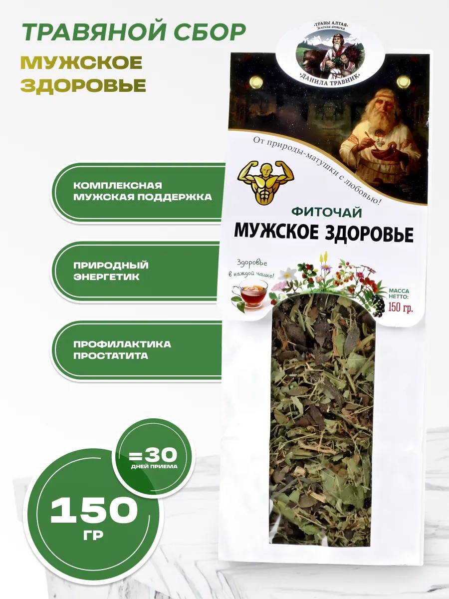 Фиточай Мужское здоровье Данила Травник 150 гр. Особенно полезен в межсезонье, в период обострения простудных заболеваний, при высоких физических и стрессовых нагрузках. Это здоровье, сила, энергия, гармония и удовольствие в одном стакане! Каждый пакетик хранит в себе частицу Алтая – травы, напитанные сакральной энергией гор Алтайской долины и целебных родников. Назначение: Фиточай «Мужское Здоровье» рекомендуется в качестве общеукрепляющего, профилактического средства при первых симптомах заболеваний мочеполовой системы у мужчин, простатите, аденоме простаты. Улучшает кровообращение и устраняет застойные явления в предстательной железе, нормализует мочеотделение, снижает частоту мочеиспускания, особенно в ночное время. Стимулирует восстановление умственной, физической и мужской половой активности. Повышает иммунитет. Применение: 1 столовая ложка сбора, на 1 стакан кипятка, настоять 30 мин, пить по 1 стакану 2-3 раза в день, за 30 мин до еды. Состав:красный корень, кипрей, зверобой, чабрец, мелисса, бадан, брусника, Срок годности: 24 мес. Не является лекарственным средством. Замечательный новогодний подарок для себя и близких!