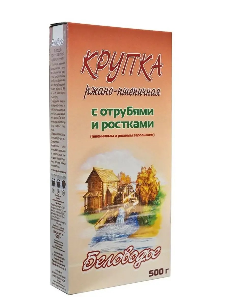 Rye-wheat porridge with bran and sprouts, 500g. Rye-wheat porridge is a simple and natural product that will help you maintain health, a cheerful mood, well-being, and excellent physical fitness. Rye-wheat porridge not only surpasses modern dietary supplements in its therapeutic and preventative properties but, unlike them, is also a complete nutritional product. Nutritionists have long proven that minerals and vitamins are best absorbed not in concentrated or isolated form, but in the form of natural foods. This product is extremely useful for restoring strength during fatigue. It is recommended for chronic colitis accompanied by constipation, gastritis, and dysbacteriosis. For medicinal purposes, it is better to use on an empty stomach in the form of a very liquid porridge cooked in water. Ingredients: A specially balanced mixture of: endosperm semolina - the central part of the grain, richest in carbohydrates; semolina of the aileron (outer) layer of the grain, which contains 80% of all minerals: P, Fe, Ca, K, Cu, etc.; wheat and rye germ (sprouts) - the center of vital force, a storehouse of proteins and vitamins: B1, B2, B6, F, PP, natural antioxidant vitamin E, 18 amino acids (10 of them essential); bran - particles of grain shells, a good source of dietary fiber, which regulates intestinal function, have a beneficial effect on its microflora and, thereby, promote natural cleansing of the body and strengthening of the immune system. Whole grain products are vital and the most desirable food for healthy intestinal microflora (intestinal bacteria), whose condition and well-being determine 80-90% of our immunity and overall health. Method of preparation: For several servings: 6 tablespoons of rye-wheat semolina, 500 ml of milk (or water), sugar, salt, butter to taste. Pour 6 tablespoons of rye-wheat semolina into 500 ml of water or milk and add salt and sugar to taste. Bring to a boil, stirring constantly, add a little butter, and then let it simmer, covered, for 5-7 minutes (along with the butter, you can also add fruit syrup, berries, or honey to taste). Rye-wheat semolina, cooked in water (not milk!), is especially beneficial for improving digestion and for those who are overweight. The semolina can also be used for breading fish, meat, and vegetable cutlets or meatballs. Shelf life: 6 months. This product is not a medicine. A wonderful New Year's gift for yourself and loved ones!