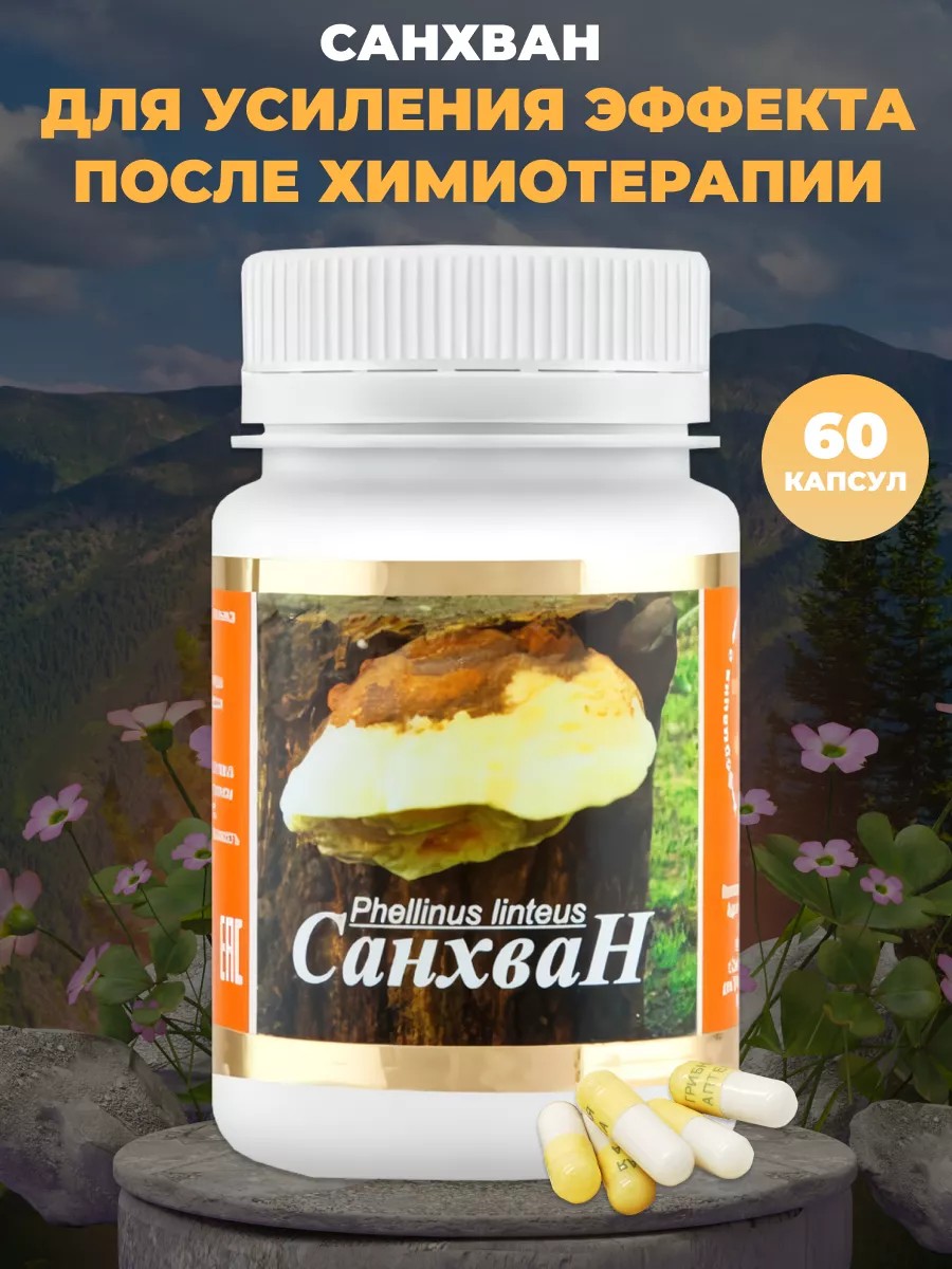 Гриб санхван - это натуральное средство, которое обеспечивает усиление эффекта после химиотерапии. Эти капсулы применяют для комплексной терапии онкологии, до, во время и после химиотерапии. Они ослабляют клеточную структуру онкоклетки, что способствует большей эффективности. Санхван не только помогает химиотерапевтическим препаратам уничтожать раковые клетки, но и обеспечивает выведение токсинов из организма, защищает от поражения здоровые клетки печени и почек, нормализует формулу крови и уровня гемоглобина. Он наиболее эффективен при раке желудка, пищевода, кишечника, простаты, молочной железы. Имеет иммуномодулирующее, общеукрепляющее и противоопухолевое действие. Помимо этого таблетки способствуют нормализации обмена веществ и лечению гепатита, а также заболеваний желудочно-кишечного тракта, органов мочеполовой системы. Их часто применят и для укрепления иммунитета.