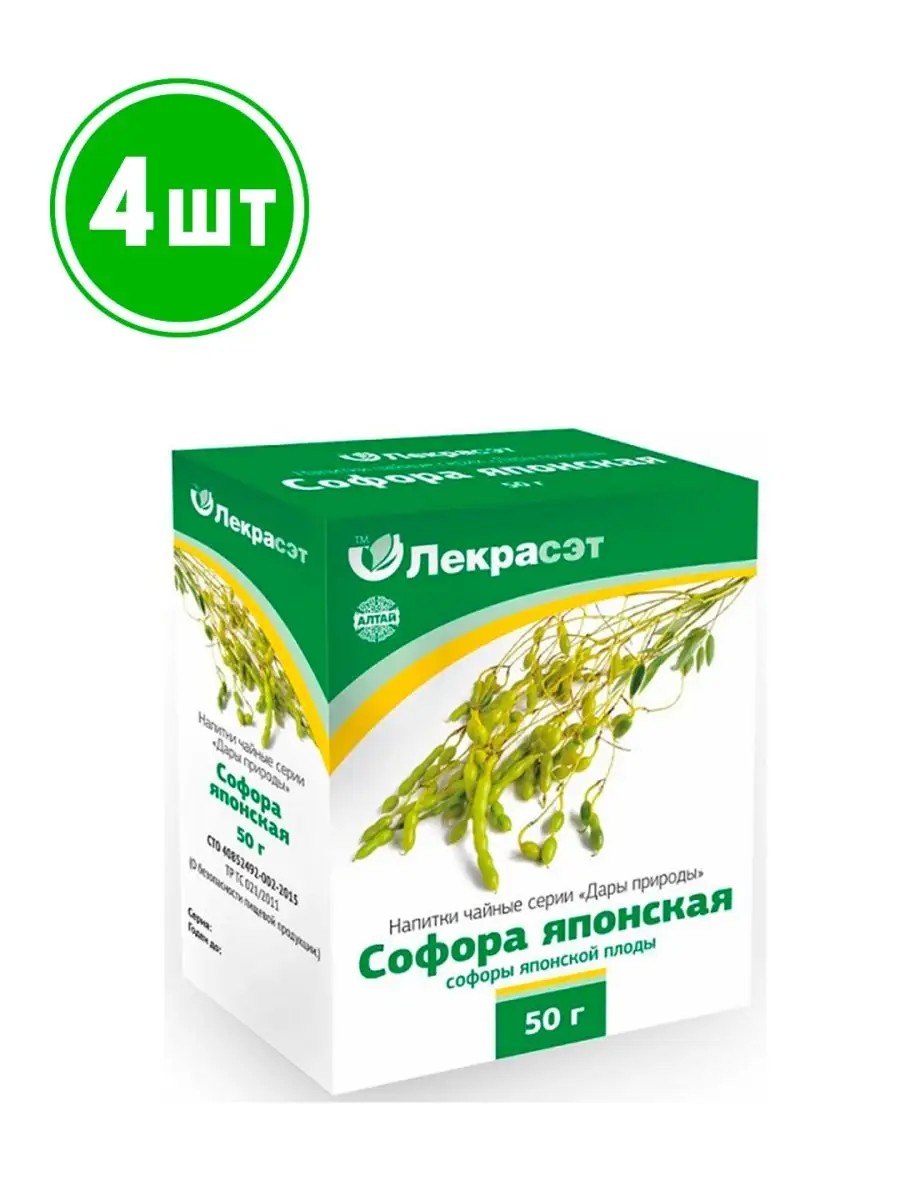 Софора японская плоды Лекрасэт 50 гр.. Рутин, который в достаточно большом количестве содержится в бутонах и недозрелых плодах софоры имеет способность (особенно в сочетании с витамином C) уплотнять стенки сосудов и уменьшать их ломкость.Поэтому применение софоры японской связано с лечением сосудистой патологии: кровоизлияния в сетчатку глаза, капилляротоксикоз, геморрагический диатез, тромбопеническая пурпура, септический эндокардит, гломерулонефроз.Также она будет полезна при гипертонической болезни, стенокардии, инфаркте, инсульте, атеросклерозе, головокружении, головных болях, тромбофлебите, сепсисе, остеохондрозе, ревматизме, сахарном диабете, заболеваниях желудка и 12-перстной кишки, при лечении и профилактике внутренних кровотечений различного происхождения.Для наружного лечения используют 5-10 -процентный раствор настойки софоры и используют его для лечения ожогов, обморожений, гайморита, мастита, псориаза, волчанки, трофических язв, также для лечения фурункулов и карбункулов, закапывают нос при насморке, делают компресс при лечении ячменя, втирают в волосистую часть головы при выпадении волос, смазывают поражённые грибком участки кожи.В виде полосканий раствор настойки софоры применяют при лечении воспалительных заболеваний дёсен и пародонтоза.Способ приготовления иприменения:1 чайную ложку (4,5 г) растительного сырьязалить одним стаканом (200 мл) кипятка, настоять на водяной бане 15 минут, процедить настой. Принимать взрослым по 1/2 стакана (100 мл)1 раз в день во время еды. Готовый настой хранить в холодильнике не более 2-х суток. Продолжительность приема - 1 месяц.Возможен повторный приемв течение года. Перед применением рекомендуется проконсультироваться с врачом.