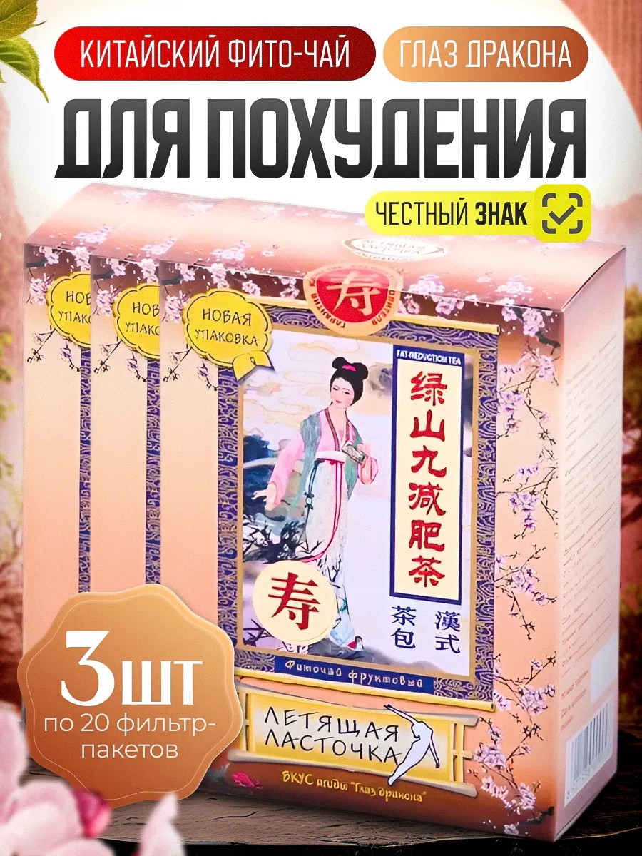 Китайский чай Летящая ласточка "Глаз Дракона" - дренажный напиток для похудения, который поможет вывести лишнюю жидкость из организма и избавиться от отечности. Фиточай без сахара обеспечивает очищение кишечника, а также обладает ферментативным действием, которое устраняет несварение пищи. Препарат для чистки организма от шлаков, токсинов и для детокса оказывает выраженный мочегонный и мягкий слабительный эффект, обеспечивая мужчинам и женщинам здоровое снижение веса. Диетический чайный пакетированный травяной сбор также очищает печень, желчный пузырь, понижает содержание жиров на стенках сосудов, в крови, оздоровляет кожу. Очищающий чай в пакетах можно использовать как натуральное слабительное и желчегонное средство жиросжигатель, способствуя улучшению микрофлоры. Эта пищевая заварочная добавка идеально подойдет не только для худеющих и сидящих на диете, но и для людей, которые придерживают пп (правильного питания). Данное жиросжигающее мягкое средство для стройности фигуры помогает избавиться от отеков, а также похудеть без вреда для здоровья. Биодобавка для детоксикации тонизирует, запуская процесс жиросжигания, жир начинает уходить равномерно: с живота, рук, ног. Напиток заварка без калорий для улучшения метаболизма и для выведения воды из организма - эффективный способ для сжигания целлюлита. Сжигатель избавляет от вздутия, запоров и работает на ускорение пищеварения. В отличие от таблеток или капсул, пакетики для заваривания позволят насладиться вкусным фруктовым напитком на травах. Фито бад - отличный выбор для мягкого и безопасного избавления от лишнего веса!