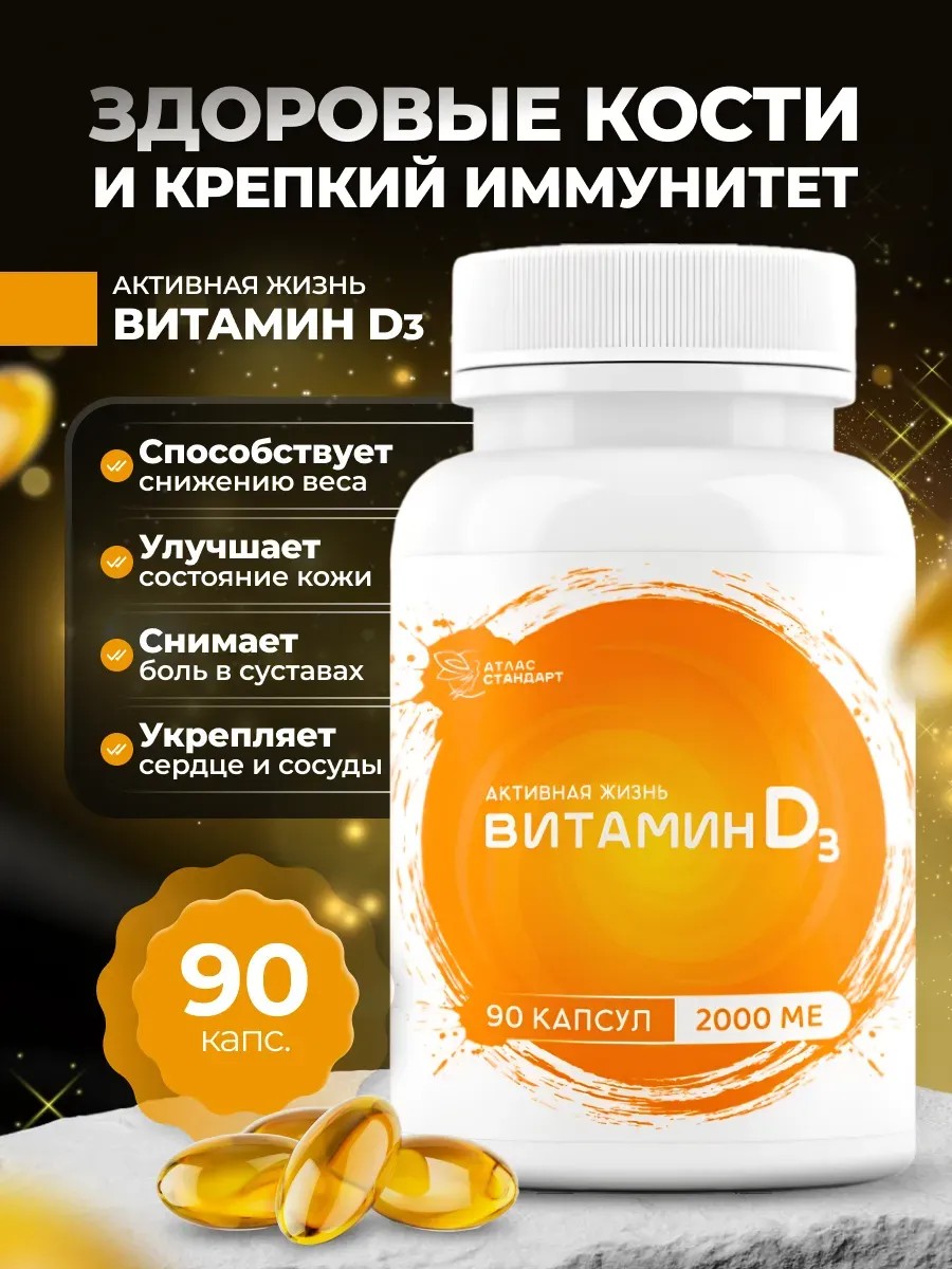 Витамин D3 2000 МЕ (50 мкг) в одной капсуле. Упаковка 90 капсул на 3 месяца ежедневного применения.Витамин D - гормон - регулирует обмен кальция и фосфора, обеспечивают нервно-мышечную проводимость, работу иммунной системы и деление клеток, препятствует отложению холестерина на стенках сосудов, снижает проявления аутоиммунных реакций.Согласно ряду клинических исследований, хронический дефицит витамина «D» у детей раннего возраста связан с высоким риском развития у них в будущем различных заболеваний: сахарного диабета, ожирения, аутоиммунных заболеваний, онкологических заболеваний, сердечно-сосудистых заболеваний, псориаза, атопических заболеваний, воспалительных заболеваний кишечника.Формой витамина D, которая оказывает воздействие на клетки (биологически активной) является кальцитриол, который образуется в печени и почках из своих неактивных (биологически инертных) предшественников (холекальциферол и эргокальциферол). Холекальциферол в основном вырабатывается в коже под действием солнечных лучей, с пищей он поступает в меньших количествах.Обеспеченность организма витамином D определяют по его предшественнику кальцидиола — 25(ОН) витамина D, концентрацию которого и определяют в крови.Дефицит витамина D определяется как концентрация 25(ОН) витамина D в крови менее 20 нг/мл (менее 50 нмоль/л), недостаточность — при концентрации от 20 до 30 нг/мл (от 50 до 75 нмоль/л). Данные уровни применимы как ко взрослым, так и к детям.Дефицит витамина D во всём мире наблюдается примерно у 1 млрд человек. Симптомы дефицита витамина Д: •снижение физической выносливости, общая слабость даже при достаточном объёме сна; •мышечная слабость, особенно в области шеи, плечевого и тазoвого пояса, бедра, лопаточной области; •спазмы в мышцах; •боли в суставах; •диффузные боли в мышцах; •нарушение равновесия; •хроническая боль; •плохая концентрация внимания; •головные боли; •перепады настроения, беспокойство или депрессия;•нарушения сна (неполноценный беспокойный сон);•повышенная потливость;•повышенное артериальное давление;•набор веса;•сухость кожи;•выпадение волос;•частые простудные заболевания;•плохое заживление ран и другие.