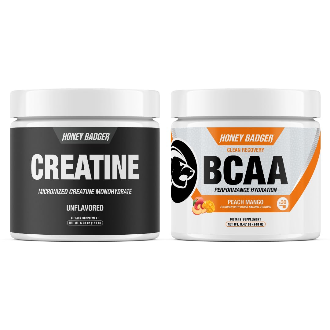 Our Creatine Monohydrate: At Honey Badger we use the best quality creatine monohydrate that is sourced from material with a NSF certification. Muscle Growth: Promotes muscle hypertrophy by increg water retention in muscle cells (cell volumization) and enhancing protein synthesis. Supports greater training volume, leading to long-term muscle gains. Zero Sugar Zero Crash: Made with natural stevia leaf extract and noncaloric ingredients meaning it's non-habit forming and won't make you crash mid-workout or post-workout. So you can keep that momentum going. Enhanced Exercise Performance: Increases phosphocreatine stores in muscles, providing quick energy for high-intensity exercises like weightlifting, sprinting, or HIIT. Improves strength, power output, and exercise capacity, allowing for more intense and prolonged workouts. Concentrated No Fillers BCAA Powder for Men Women: Reach your recovery and endurance fitness goals with Honey Badger keto pre workout. Keto, paleo, vegan, made in the USA with ZERO sugar, sucralose, or gluten.