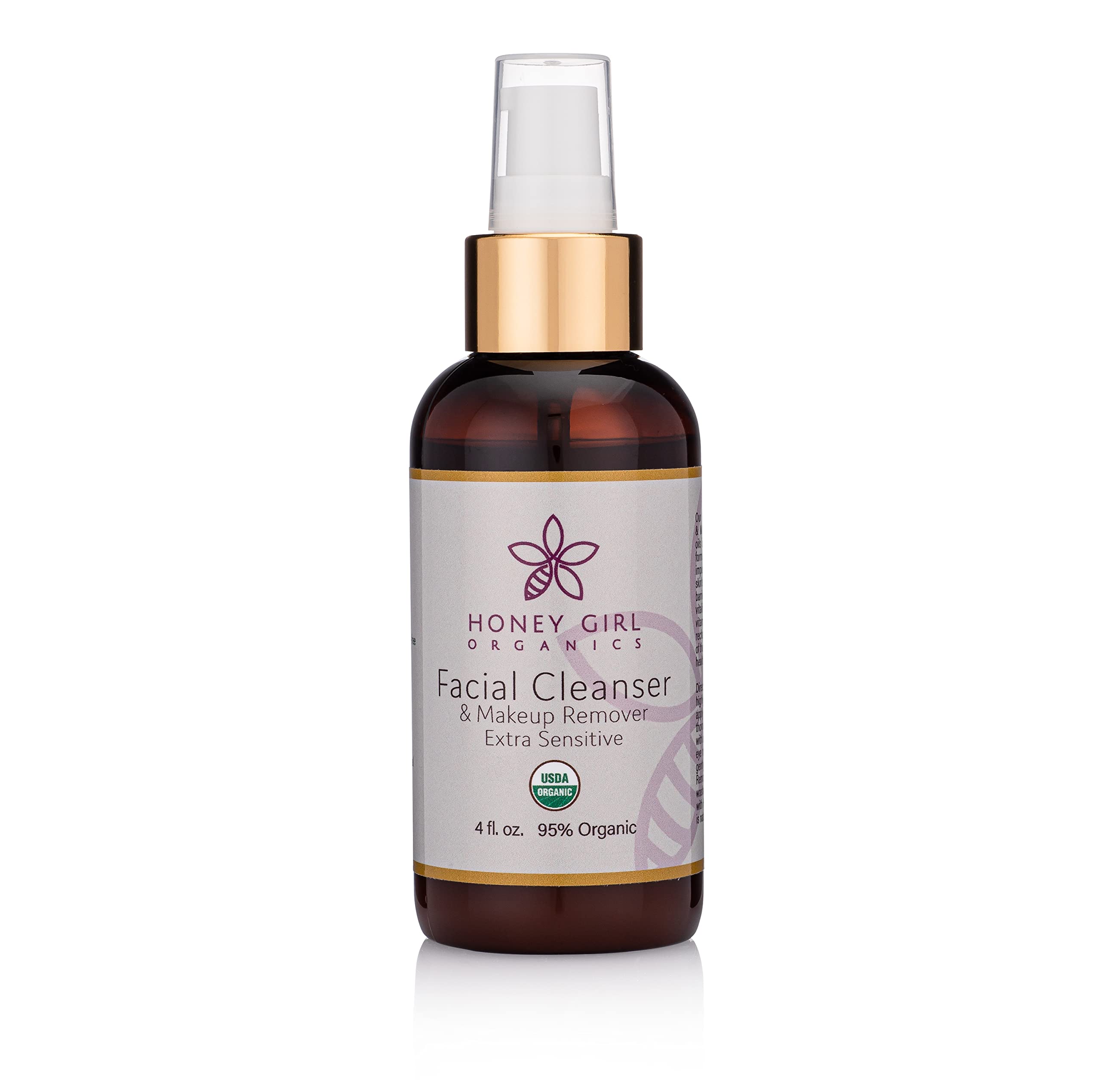 SHAKE WELL before each use. This formula is highly concentrated. To cleanse, gently massage small amounts onto moist face in circular motions with fingertips. Then use a warm damp washcloth to wipe excess cleanser and remove excess oils. Leaves your skin moisturized and conditioned. HONEY GIRL ORGANICS FACIAL CLEANSER EXTRA SENSITIVE is soothing and gentle enough for the delicate skin around your eyes, and can easily remove stubborn false eyelash glue, makeup, dirt and excess oils while stimulating your skin with a complex of vitamins minerals. IT'S SIMPLE YET SIGNIFICANT - We've removed essential oils from the formulation to ensure maximum compatibility with even the most sensitive skin types. 95 ORGANIC MAKEUP REMOVER features a blend of bee byproducts and Organic Extra Virgin Olive Oil. This formula aids in cleansing, hydrating, and balancing irritated extra sensitive skin. ORGANIC-FACIAL-CLEANSER-EXTRA-SENSITIVE gently removes makeup and dirt without stripping it of its oils. Our natural face cleaner eases inflammation and loosens and dissolves impurities to restore your glowing skin.