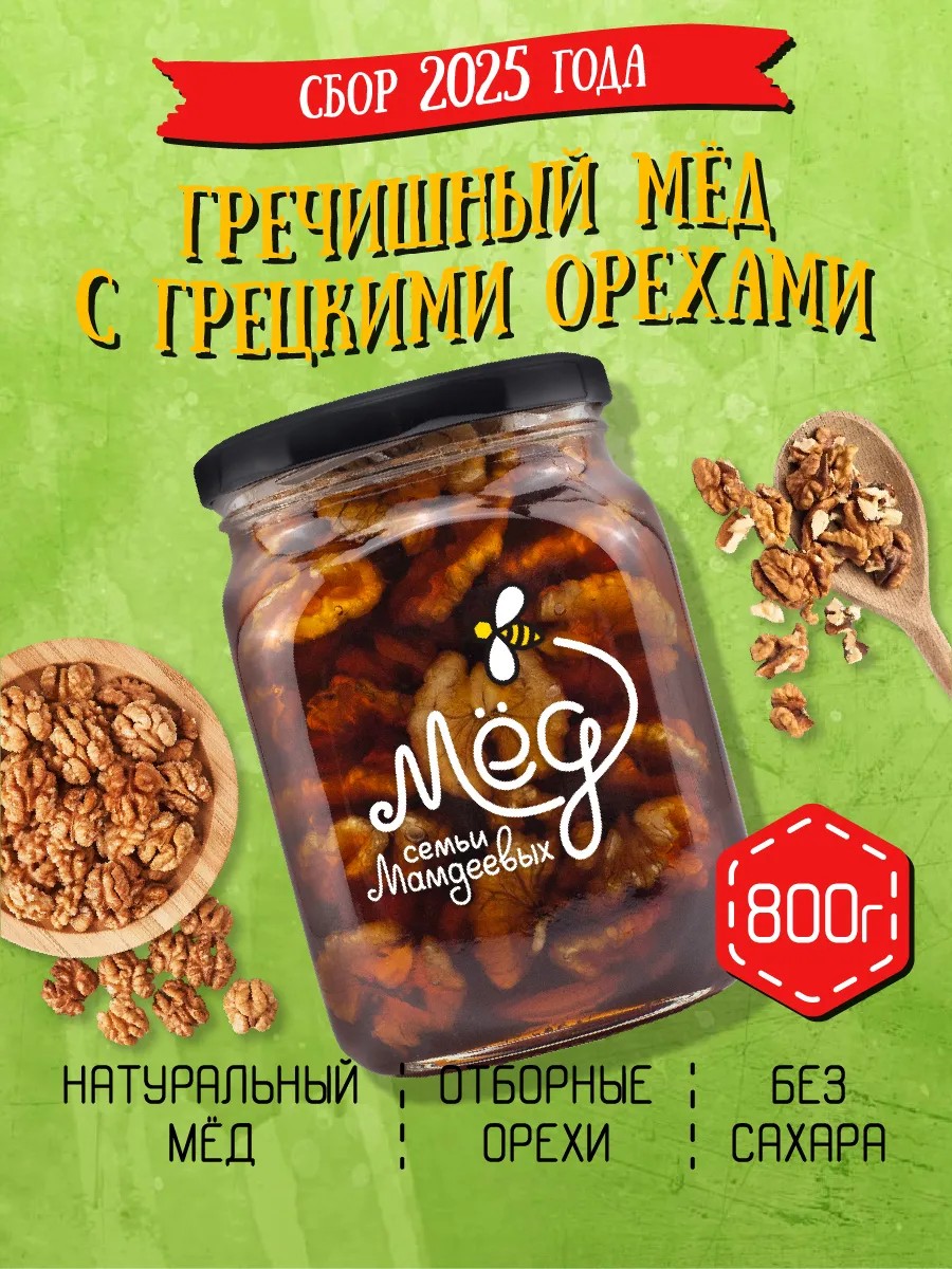 Мёд семьи Мамдеевых Гречишный мёд с грецким орехом, 800 г, продукты