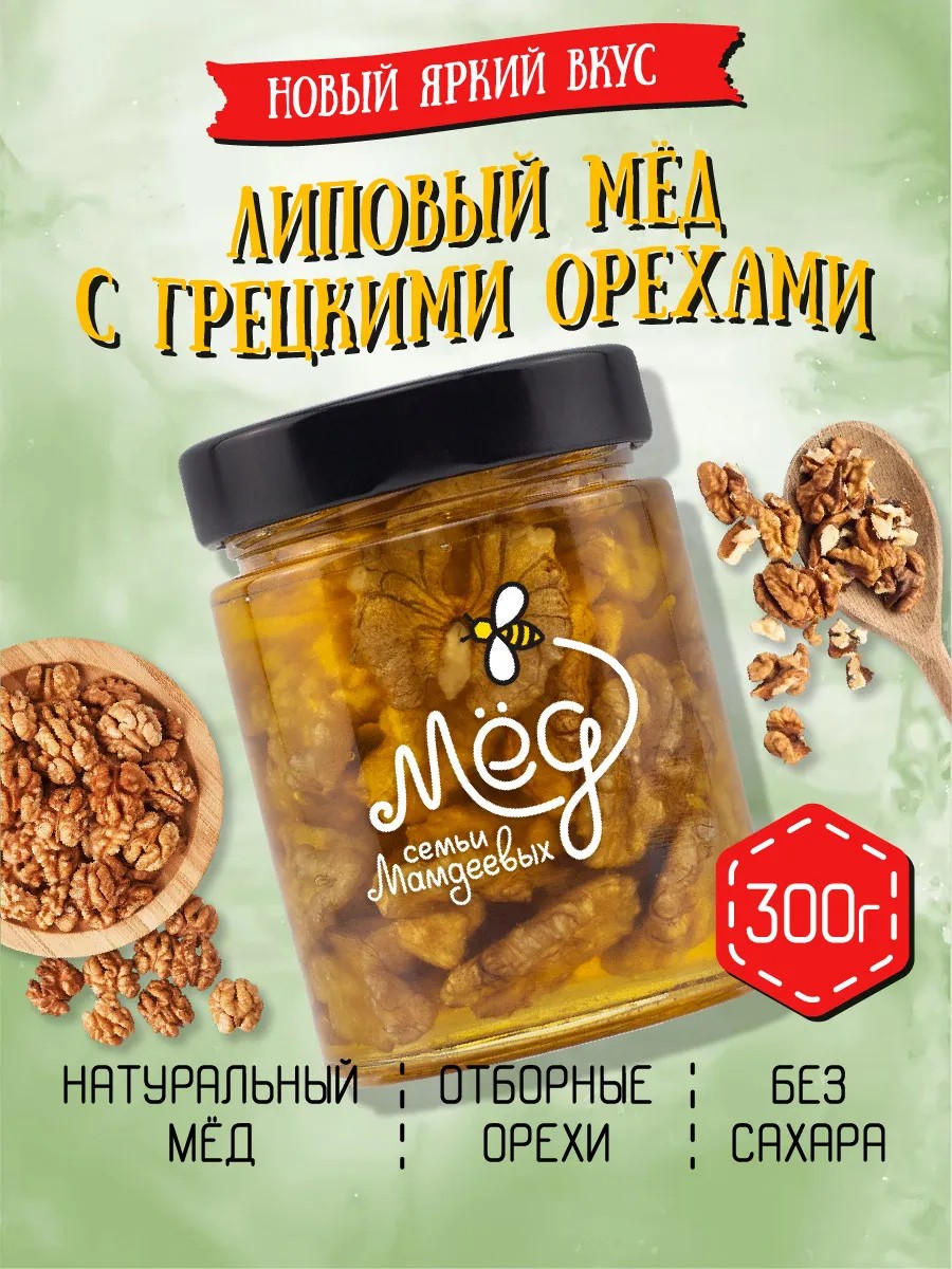 Мёд семьи Мамдеевых Липовый мед с грецким орехом, 300 г, постные сладости
