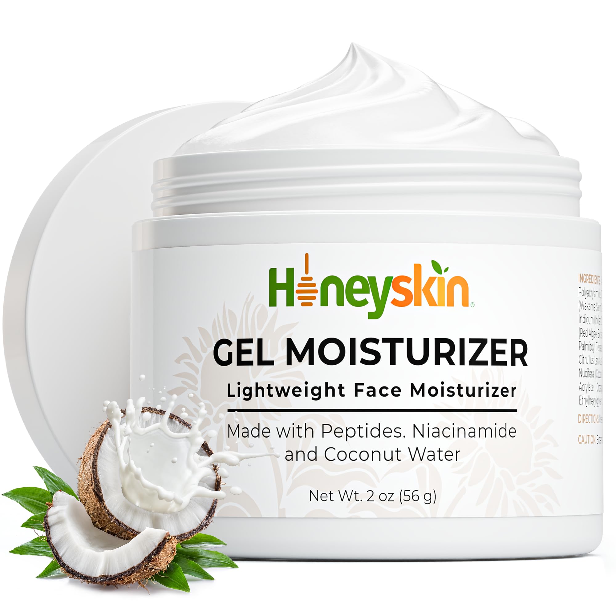 Honeyskin's ultra-lightweight facial moisturizer delivers intense, yet weightless long-lasting hydration with no heavy after-feel to keep your skin hydrated and healthy. Made with natural and clean ingredients like coconut water, horsetail extract, peptides, and niacinamide, this face moisturizer offers several skin-perfecting benefits as it promotes cell regeneration, increases skin hydration, boosts collagen production, visibly reduces the appearance of fine lines and wrinkles, builds a strong skin barrier, locks in moisture prevents environmental damage for smooth, supple, and healthy, hydrated skin!Honeyskin's ultra-lightweight face moisturizer for women men delivers intense, yet weightless long-lasting hydration with no heavy after-feel. Our perfectly pH-balanced 5.5 facial moisturizer is free of harmful chemicals that may damage not only your skin but your health. This skin tightening cream is paraben-free, sulfate-free, and cruelty-free. Not only a face moisturizer for dry skin, this face care cream is safe for all skin types. Made in the USA responsibly sourced skincare product. NON-GREASY FORMULA – Experience the deep hydration of a cream in a lightweight gel that absorbs effortlessly, perfect for wearing under makeup. Powered by Vitamin E, this moisturizer acts as an antioxidant to protect your skin and lock in moisture. Infused with vitamins, minerals, and botanicals, it leaves your skin feeling smooth, supple, and naturally radiant. MANUKA HONEY - This gel moisturizer isn't your ordinary skincare product. Powered by New Zealand's Manuka Honey, it boasts exceptional skin-loving properties that help prevent acne while acting as a humectant to pull in moisture for a natural, dewy glow. Aloe Vera complements with antioxidants, enzymes, and Vitamins A C, offering soothing hydration to ease burns, acne, and the dry, itchy skin associated with eczema. CLEAN AND NATURAL INGREDIENTS - this facial moisturizer fights signs of aging skin dehydration. Coconut Water soothes skin, promotes cell regeneration increases skin hydration Horsetail Extract boosts collagen production, smooths fine lines wrinkles protects against free radical damage Peptides help support build a strong skin barrier, plump fine lines wrinkles repair damaged skin Niacinamide helps build proteins in the skin, lock in moisture prevent environmental damage. HEALTHY AND HYDRATED - Honeyskin Honey Gel Moisturizer is Formulated for daily wear, this lightweight face moisturizer releases a burst of powerful and skin-improving nutrients and potent ingredients to provide longer-lasting hydration for instantly smooth and supple skin all day long. With Honeyskin gel moisturizer, rest assured that your skin will be feeling the benefits of all the hydration it needs in no time flat.