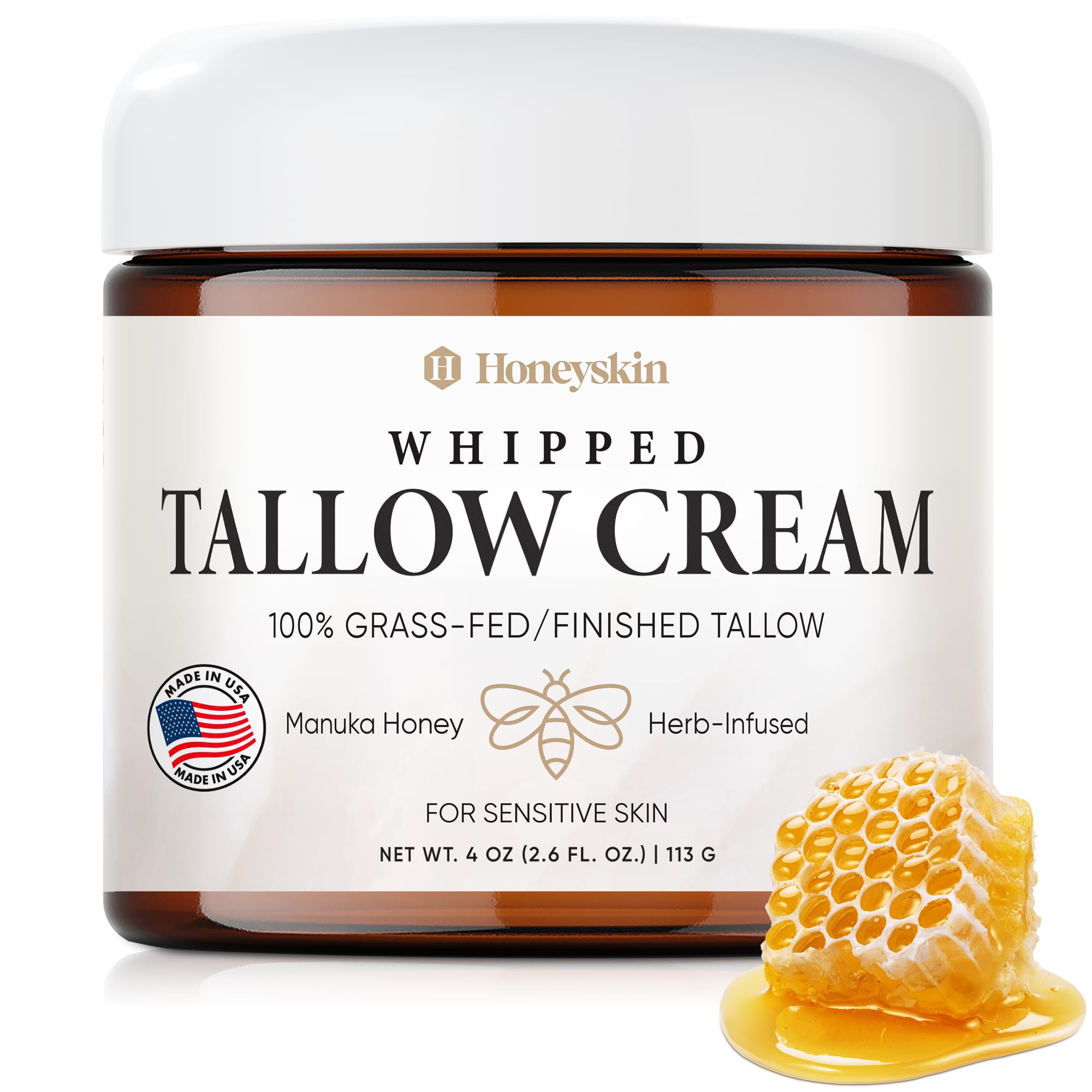 Honeyskin Whipped Tallow and Honey Cream 100% Grass-Fed All Natural Mountain Beef Tallow for Skin Face Moisturizer Nourishing Hydrating Cream for Dry Sensitive Skin Gentle Soothing Care 4oz 4 Ounce (Pack of 1)