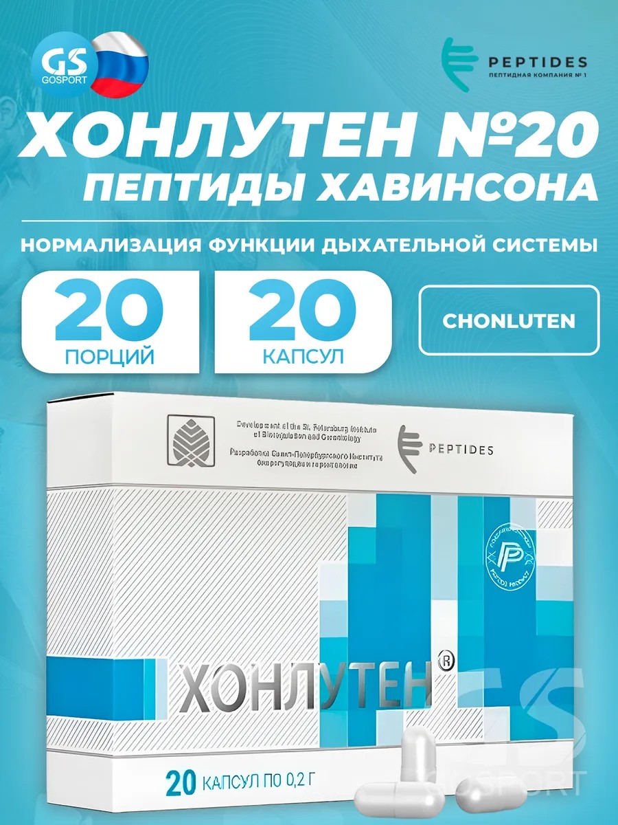 Годен до 03.10.2027. Хонлутен (Chonluten) 20 капсул. Пептиды бронхо-легочной системы - ХонлутенСистема органов дыхания — это совокупность структур, позволяющих улавливать кислород и выводить углекислый газ, образованный внутренним дыханием. Центральный орган — это легкие, расположенные по обе стороны сердца. Заболевания легких способствуют развитию патологических процессов, приводящих к снижению кислорода в крови. Что ведет к снижению объема легких и развитию дыхательной недостаточности, приводящей к инвалидности, значительно снижая качество жизни. Для нормализации и коррекции патологических изменений в легких, возникающих в результате различных заболеваний, был разработан биорегулятор органа дыхания - Хонлутен.Хонлутен представляет собой пептидный комплекс, содержащий аминокислоты, способствующие нормализации функции и клетки лёгких и слизистой оболочки бронхов.При клиническом изучении установлена эффективность Хонлутена в комплексной профилактике и лечении пациентов с нарушением функций лёгких и бронхов при острых и хронических заболеваниях органов дыхания инфекционного и неинфекционного происхождения, а так же для поддержания функции органов дыхания у людей пожилого и старческого возраста.Установлено, что курсовое применение Хонлутена, в дополнение к средствам общепринятой терапии у больных с дыхательной недостаточностью и поражением легких, способствовало улучшению самочувствия, снижению частоты приступов кашля и удушья, уменьшению количества отделяемой мокроты, повышению физической работоспособности. Отмечена положительная динамика в виде уменьшения количества хрипов, а также снижение выделяемой мокроты, что отражало общую тенденцию снижения воспалительных проявлений заболевания.Применение Хонлутена у спортсменов высшей категории в процессе подготовки к соревнованиям позволило повысить показатели аэробной мощности и кислородного пульса, увеличить дыхательный резерв. Что привело не только к приросту физической работоспособности по сравнению с исходным уровнем, но и сохранило ее до конца спортивного сезона. В результате исследований было показано, что Хонлутен обладает способностью стимулировать функциональную активность основных клеточных элементов ткани легкого, снижать уровень спонтанной гибели клеток. Тем самым препарат оказывает трофическое и стабилизирующее действие на ткань легкого и бронхов, улучшает ее функции.Хонлутен хорошо переносится пациентами, при этом не было выявлено побочного действия, осложнений, противопоказаний и лекарственной зависимости.Рекомендован: хроническая дыхательная недостаточность, хроническая сердечно-легочная недостаточность, после пневмонии, последствия длительной искусственной вентиляции легких, респираторный дистресс-синдром, туберкулез легких в стадии ремиссии, травмы грудной клетки, ожоги верхних дыхательных путей, последствия токсических поражений легких, в том числе отравления угарным газом, интенсивные занятия спортом, для поддержания функции дыхательной системы у людей пожилого и старческого возраста.Состав:Пептидный комплекс АС-5 (аргинин, глутаминовая кислота, аспарагиновая кислота), носитель МКЦ; оболочка капсулы (гидроксипропилметилцеллюлоза, вода очищенная, каррагинан, ацетат калия), антислеживающий агент кальциевая соль ст