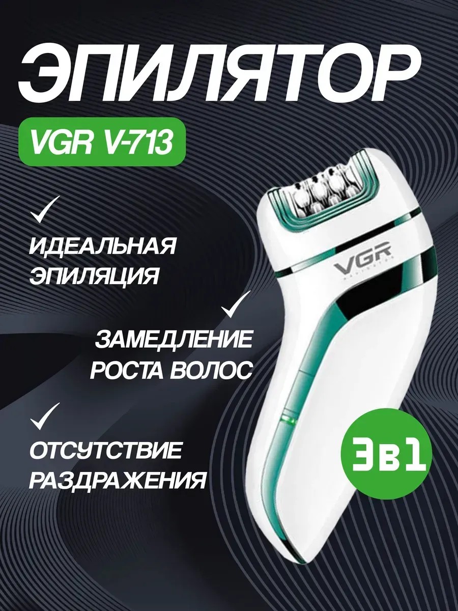 Женский электроэпилятор 3 в 1. Имеет 3 насадки - бритва, пилка и соответсвено эпилятор. Насадка электробритвы может качествено выполнять функции депиляции, т.к. имеет хорошее лезвие, а мощный мотор 5 Вт подходит для всех типов волос, с легкостью удаляет длинные и короткие волосы. Электро станок с насадкой эпилятора имеет 18 пинцетов и отлично справляется с задачей эпиляции, как триммер или дипилятор. В свою очередь аппарат с насадкой пилки(пилочки) эффективно выполняет функцию пилинга для пяток и многих других частей тела. Предусмотрена одна скорость работы. Удаляет волосы в интимной зоне бикини, ног, лица. Такая техника имеет более долгий эффект, чем лазерный депилятор. Такая бытовая техника поможет долго сохранять женскую красоту и здоровье. Такую машинку(epilyator) можно без проблем использовать в душе (водонепроницаемая) для чистки, бритья. У данного средства имеется мощная батарея, зарядка которой не занимает больше 60 минут, а мини провод, шнур зарядка (зарядное устройство) в комплекте позволит сделать это без проблем. Дипелятор имеет индикатор зарядки, что делает бритье еще более комфортным. Прибор тример имеет полный набор бритвенных принадлежностей, помогая наиболее нежному уходу. Аккумулятор устройства позволяет пользоваться товары беспроводная(аккумуляторный). Депелятор 3в1 ручной игольчатый может подойти для бритья носа, бровей, подмышек в зоне маски позволяя делать аккуратные полоски, как лазер, восковой. Эпилятор VGR зарекомендовал себя, как достойная альтернатива таких брендов как philips (филипс), braun и rowenta. Данный электро эпилятор отличается более приемлемой ценой, и продолжая строго положительно вляить на красоту и здоровье владелицы, не вызывая проблем со здоровьем кожи, как то бывает делает лазерный фотоэпилятор или шейвер.